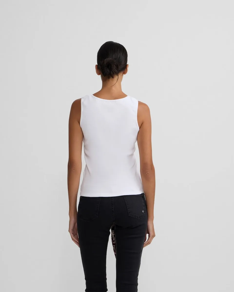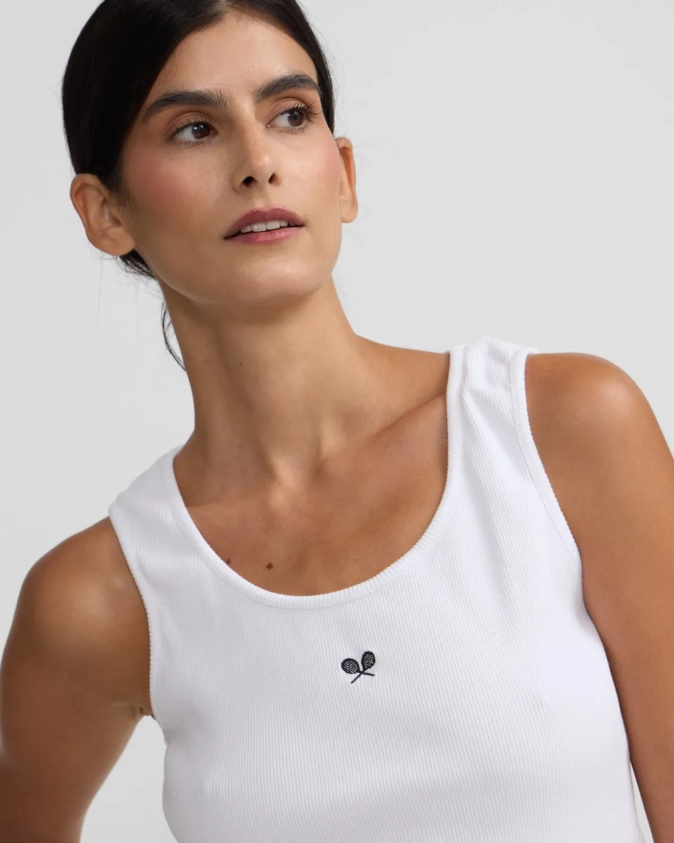 Футболка из 100% хлопка с приталенным кроем Slim fit. Имеет лямки в стиле tank с белым рифленым узором и контрастной вышивкой логотипа с изображением ретро-ракетки черного цвета по центру. Сделано в Португалии.