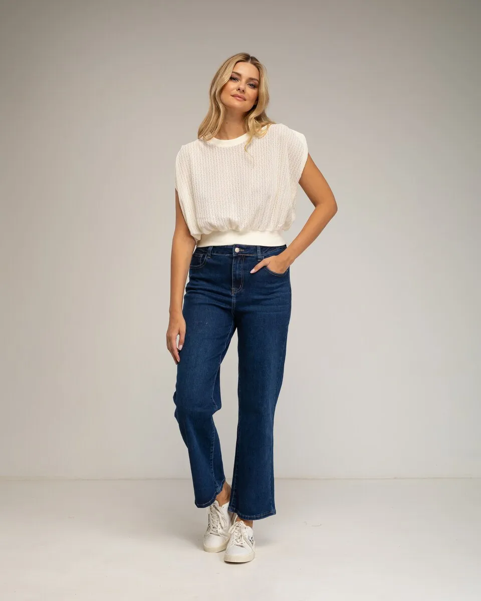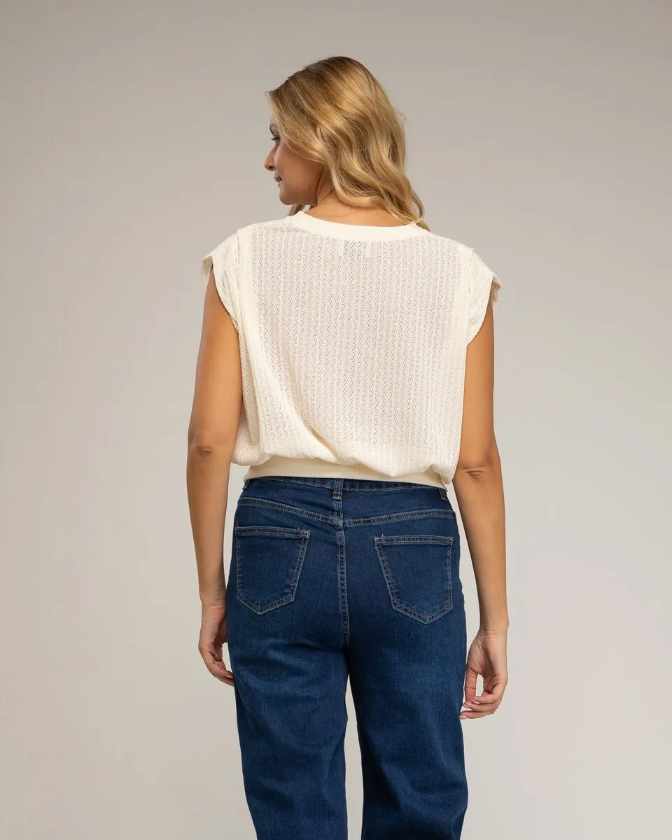 Вязаный ажурный топ без рукавов с драпировкой на плечах и резинкой на талии.