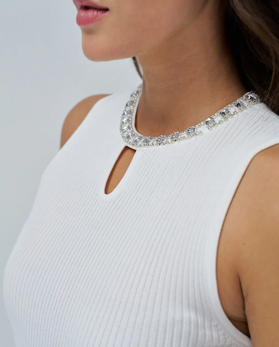 Сдержанный блеск, гарантированная уверенность. Этот топ в рубчик создан для дней, когда солнце, кажется, никогда не заходит. С приталенным кроем, подчеркивающим линии тела, это универсальная и очаровательная вещь. Круглый вырез преображается благодаря разрезу в центре груди, а блестящие аппликации на воротнике добавляют нотку сияния. Без рукавов и с комфортной посадкой, этот топ идеально сочетается с чем угодно, от джинсов до более свободных юбок. Незаменимая вещь сезона, которая воспевает тепло, легкость и расслабленную атмосферу длинных летних дней. - Топ в рубчик - Белый цвет - Приталенный крой - Без рукавов - Круглый вырез - Разрез на груди - Блестящие аппликации на воротнике Для справки: модель ростом 1,74 м, размер S.