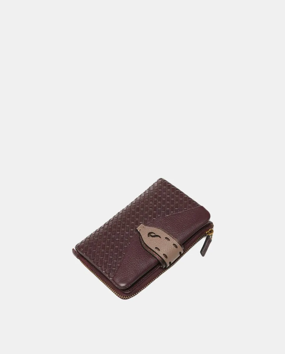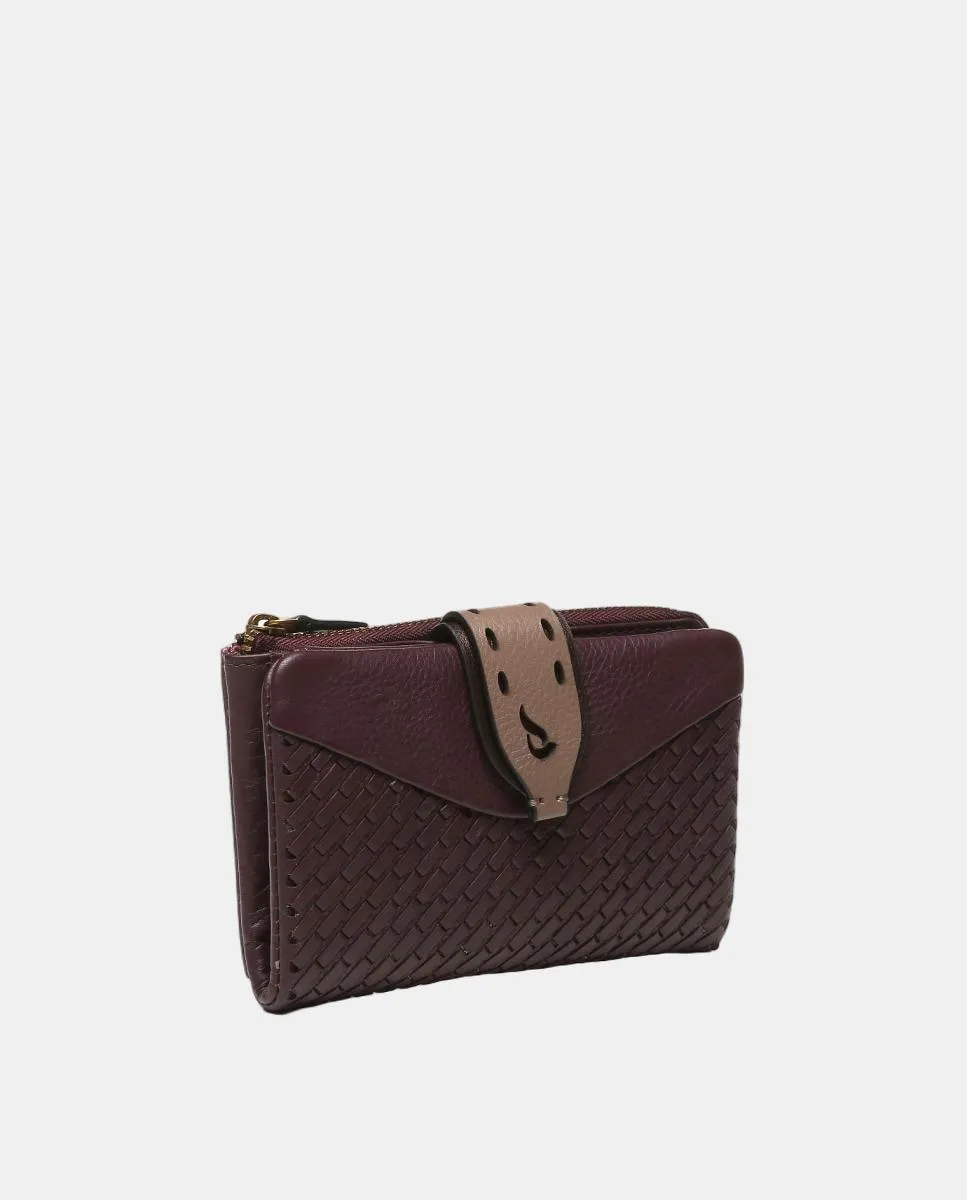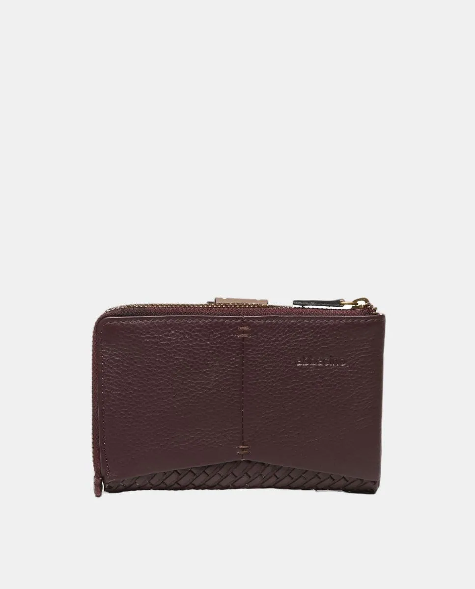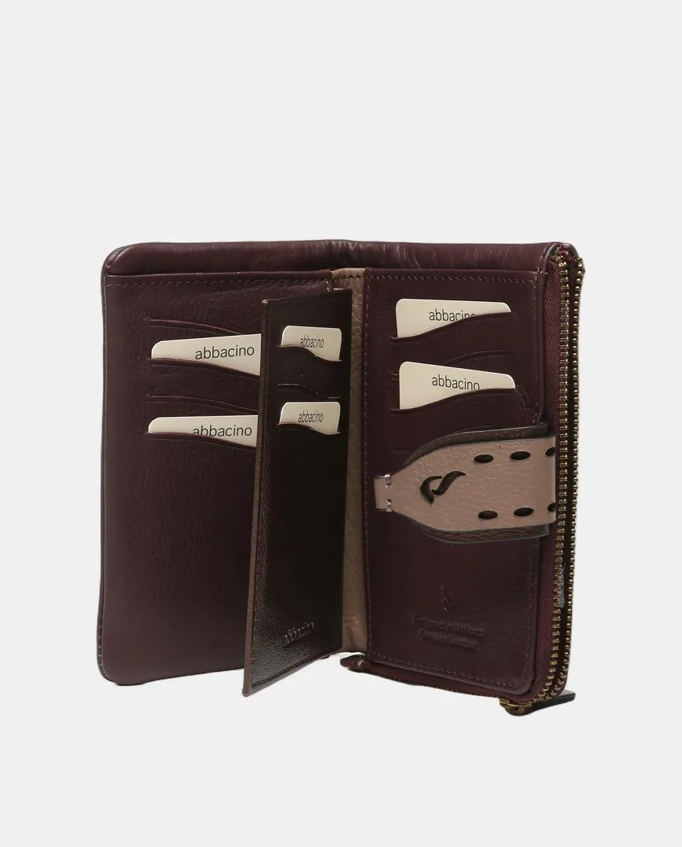 Среднего размера женский кошелек, выполненный из премиальной кожи, который выделяется деталями из кожи на передней поверхности и застежкой контрастного цвета. Среди его основных характеристик: изготовление из коровьей кожи, несколько внутренних слотов для карт и отделение для купюр, съемный кардхолдер, большое внешнее отделение для монет на молнии, а также логотип Abbacino, выгравированный на застежке.