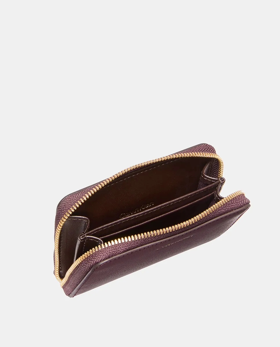 Женский кошелек бордового цвета с логотипом Calvin Klein. Внутри отделения для карт с двумя секциями. Застежка на молнии.