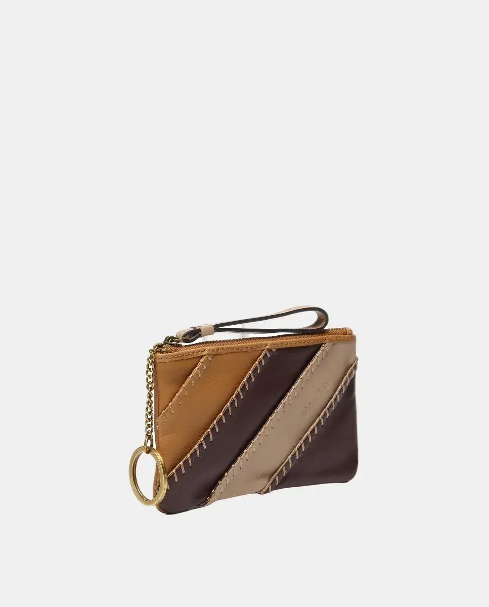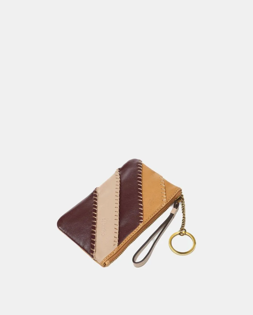 Женский кошелек из премиальной кожи, выделяющийся сочетанием различных пэчворков в разных цветовых оттенках, которые гармонично дополняют друг друга. Основные характеристики включают: застежку на молнии, маленькую ручку для переноски и компактный дизайн в стиле мини, идеально подходящий для практичного и элегантного ношения необходимых вещей.
