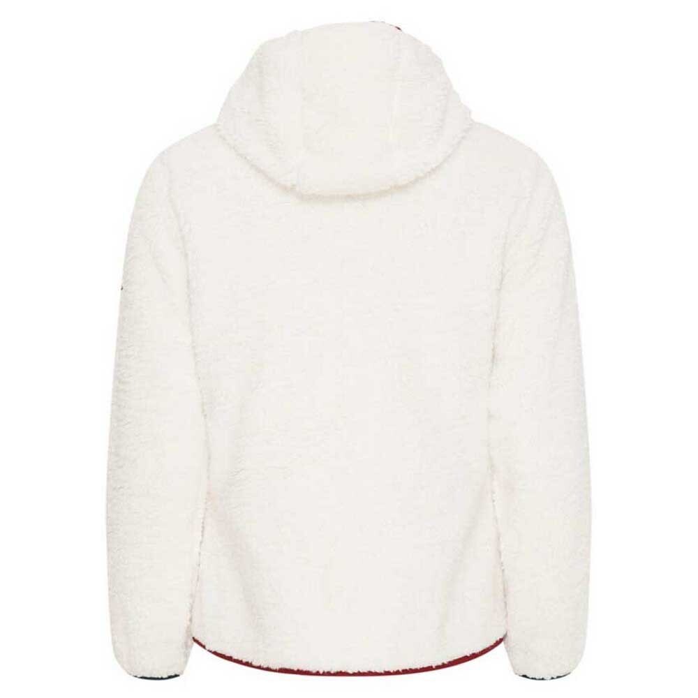 Мягкий флис Тедди с трехцветной молнией, контрастными цветными лентами на капюшоне, подоле и рукавах.