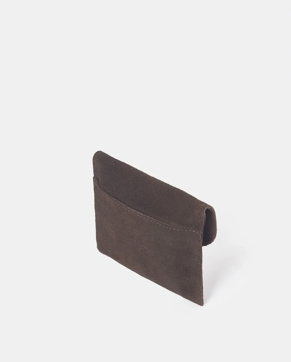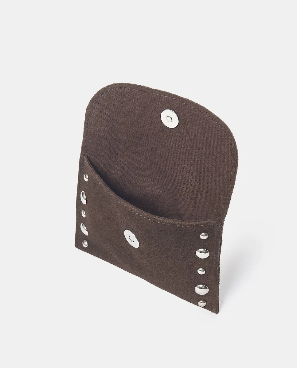 Кожаный кардхолдер коричневого цвета с деталями из заклепок.