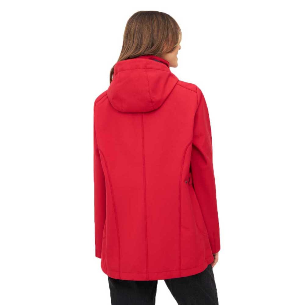 Куртка из софтшелла с регулируемыми ремнями на талии, двусторонней молнией спереди и съемным капюшоном.