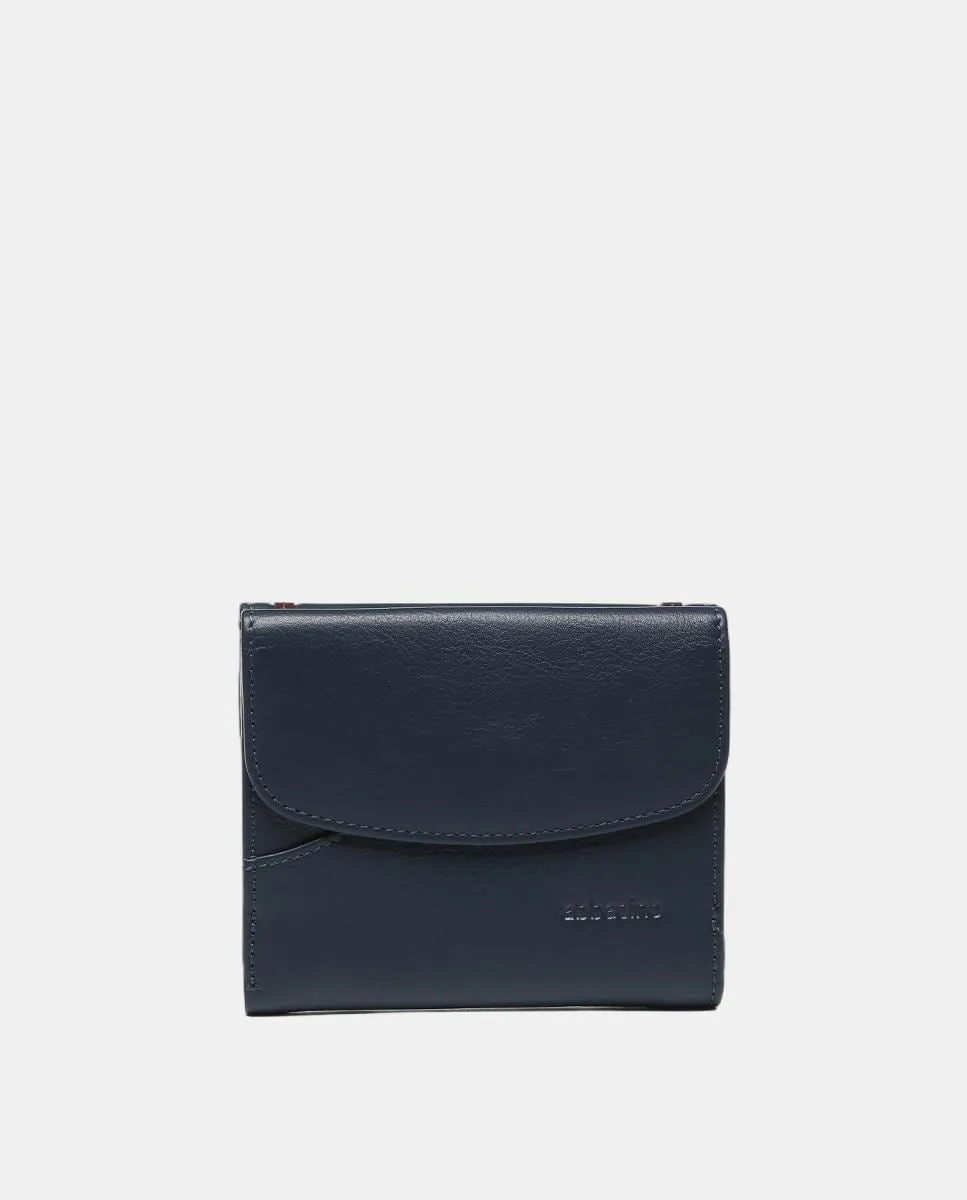 Женский кошелек из премиальной кожи, который выделяется застежкой с клапаном и контрастной полосой на нем. Основные характеристики включают: изготовление из телячьей кожи, внутреннее пространство с несколькими отделениями для карт и отделением для купюр, а также логотип Abbacino золотистого цвета на передней стороне. Компактный мини-дизайн делает его удобным и практичным, идеально подходит для того, чтобы организованно носить все необходимое.