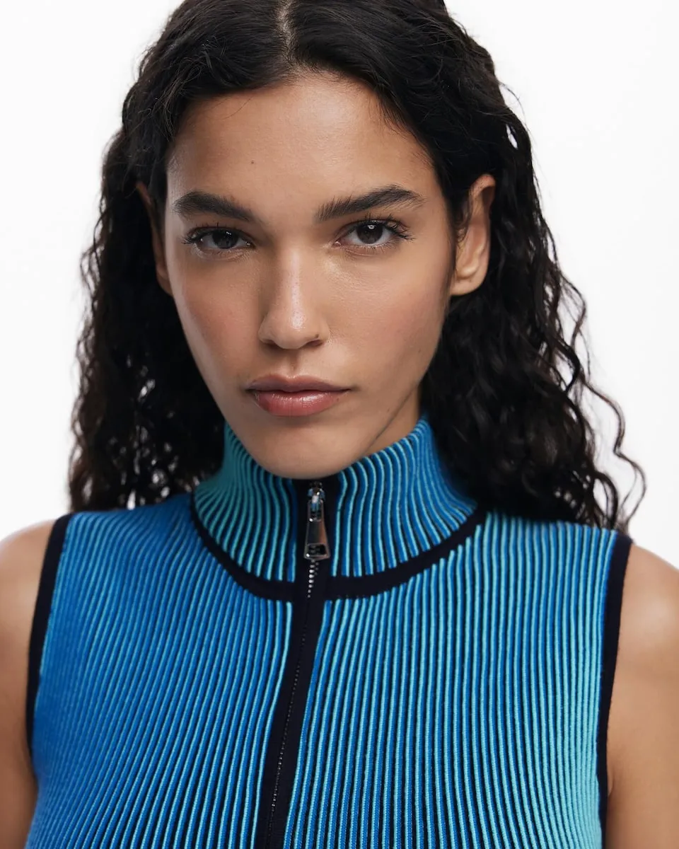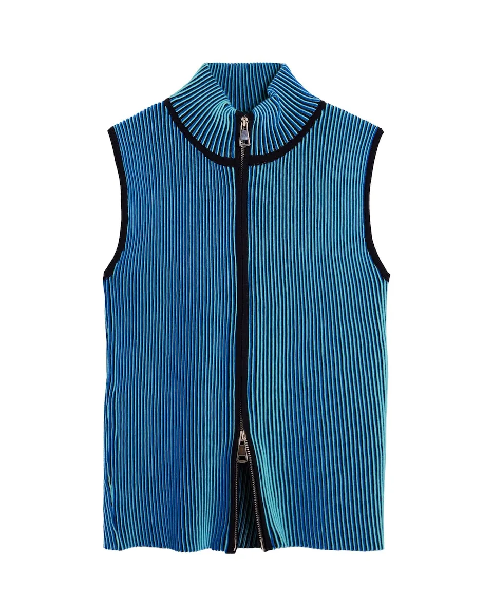 Приталенная футболка с воротником-стойкой, без рукавов с молнией и объемным вертикальным полосатым принтом. Цвет: разноцветный. Посадка: приталенная. Рукав: без рукавов. Застежка: на молнию.