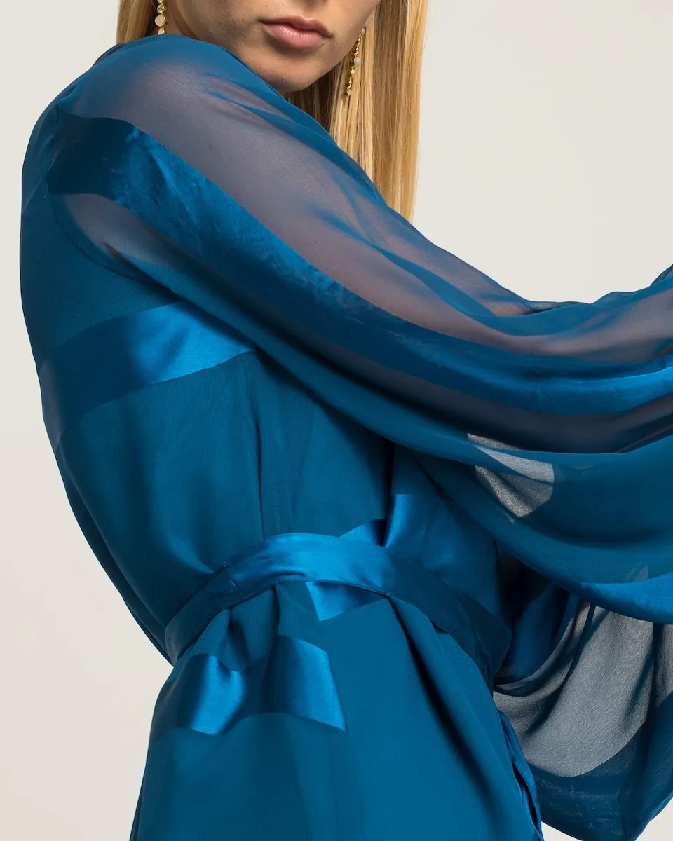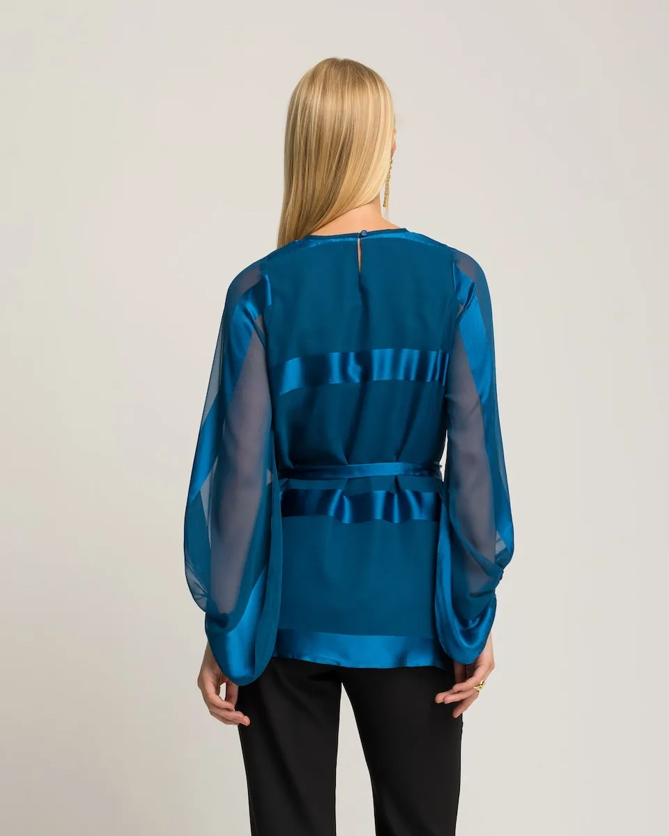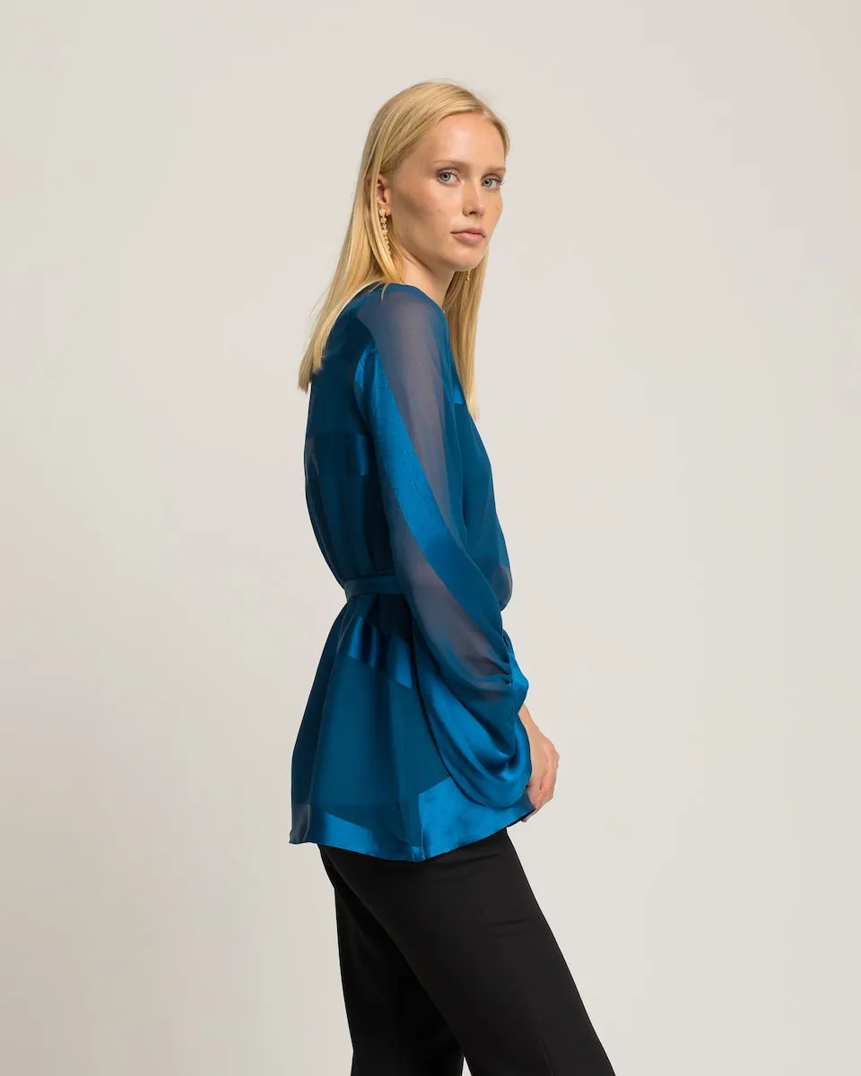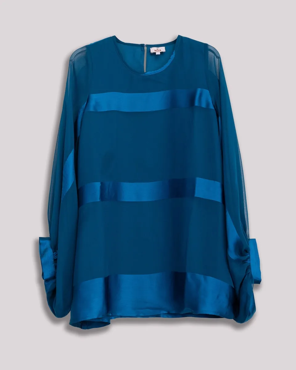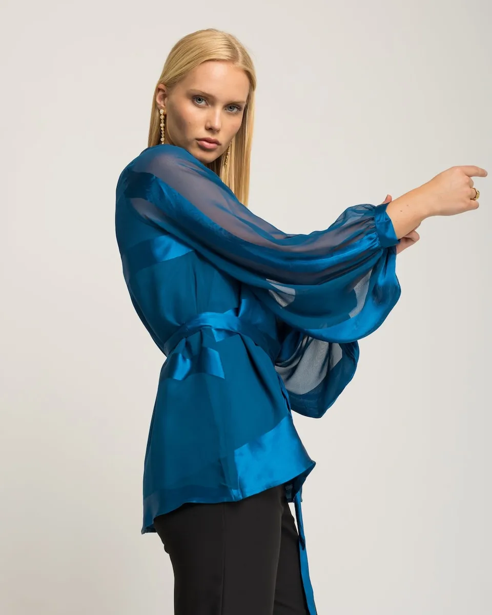 Изысканное изделие, струящееся с элегантностью. Эта синяя блузка сочетает атласные полосы с полупрозрачными рукавами, создавая визуальную игру текстур. Пояс из такой же ткани подчеркивает силуэт с изысканным и современным оттенком.