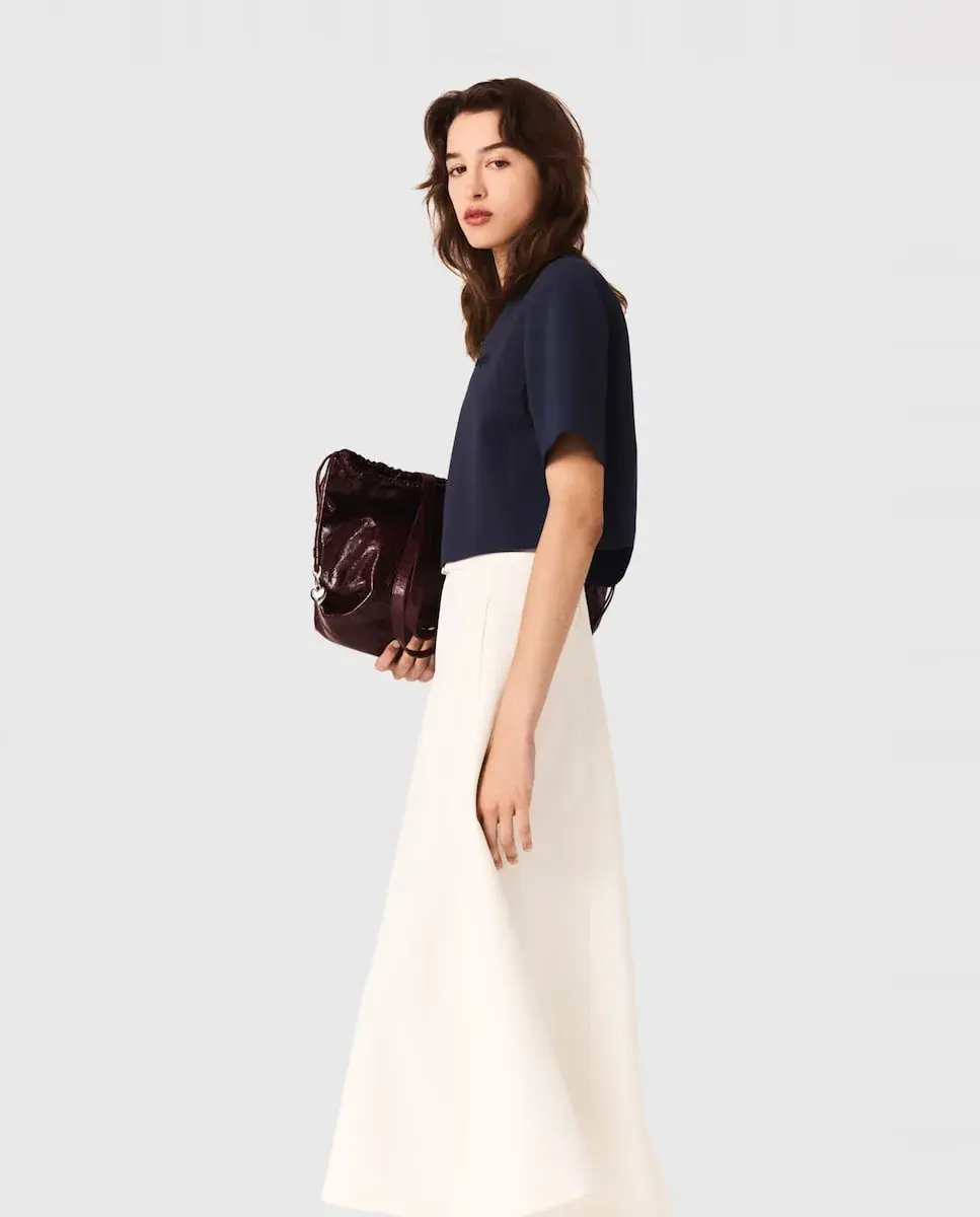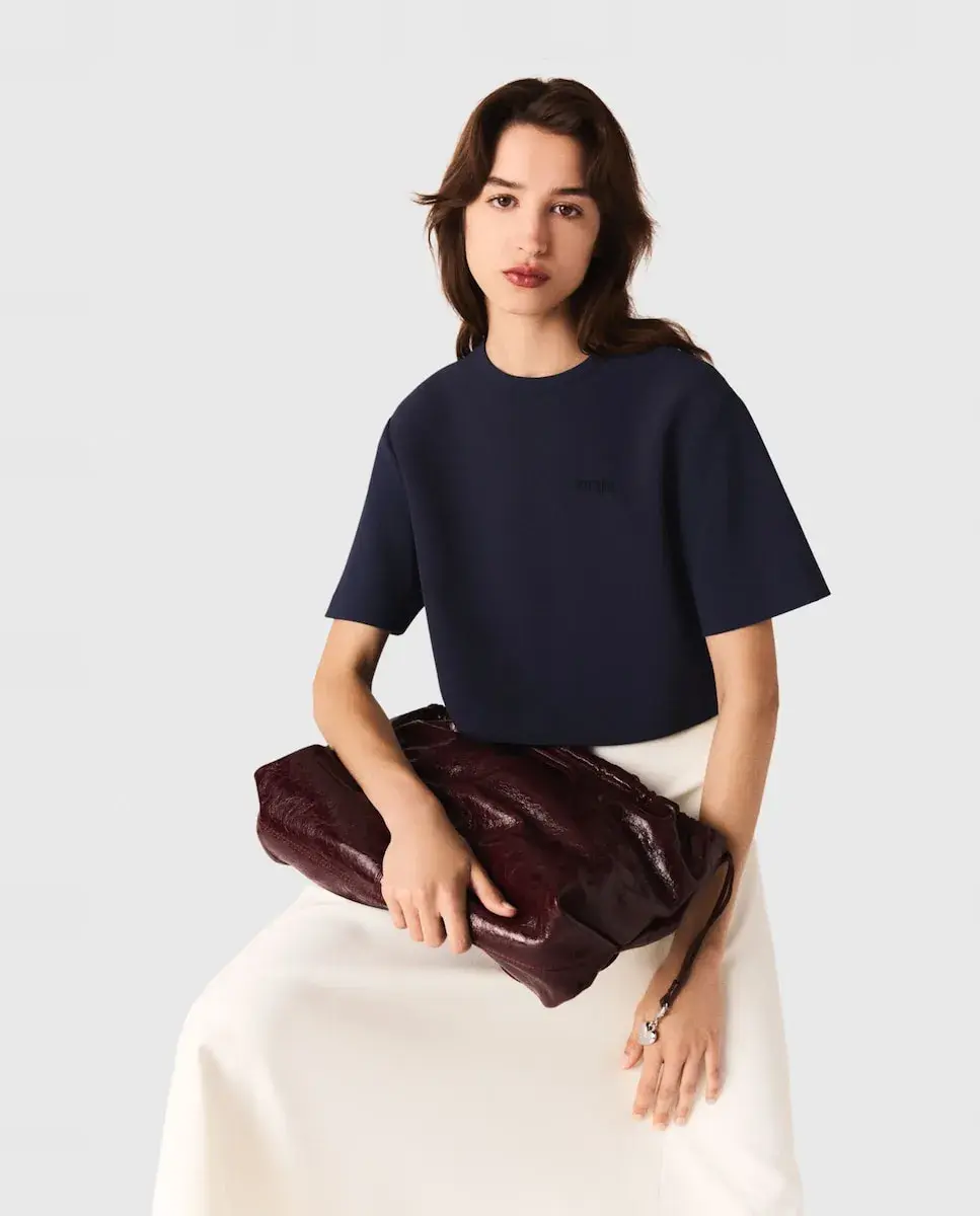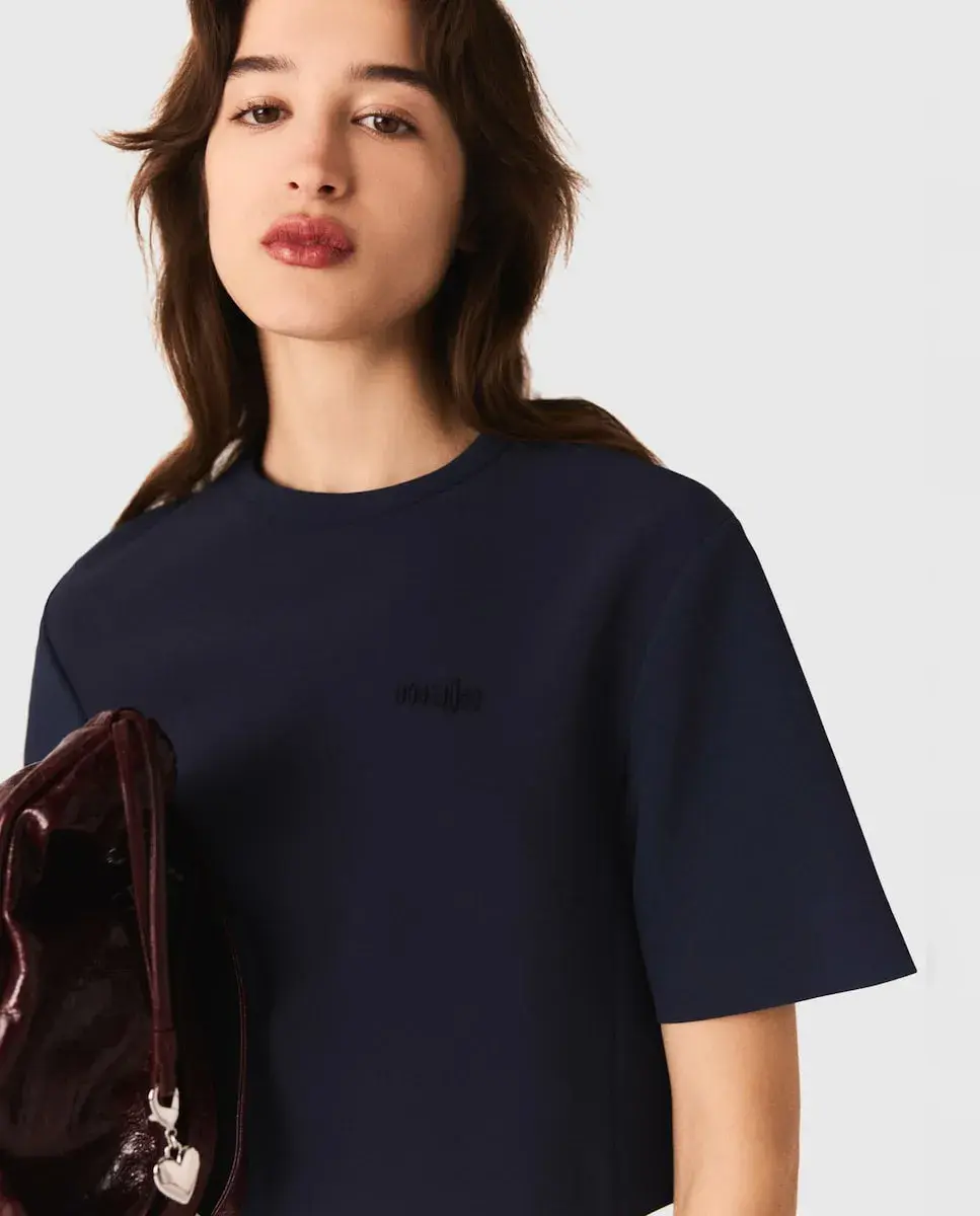 Короткий топ с круглым вырезом и короткими рукавами. Вышивка Maje на груди. Разрез с пуговицами на спине. Между графическими линиями и блестящими деталями коллекция переосмысливает базовые элементы с легким оттенком элегантности. Созданный, чтобы оживить ежедневные базовые вещи, этот топ воплощает продуманную простоту. Его короткий крой, характерная вышивка и разрез с пуговицами на спине придают ему особый шарм, идеальный для образов с характером. Можно носить с джинсами с высокой талией или со структурированной юбкой для красивой игры контрастов.