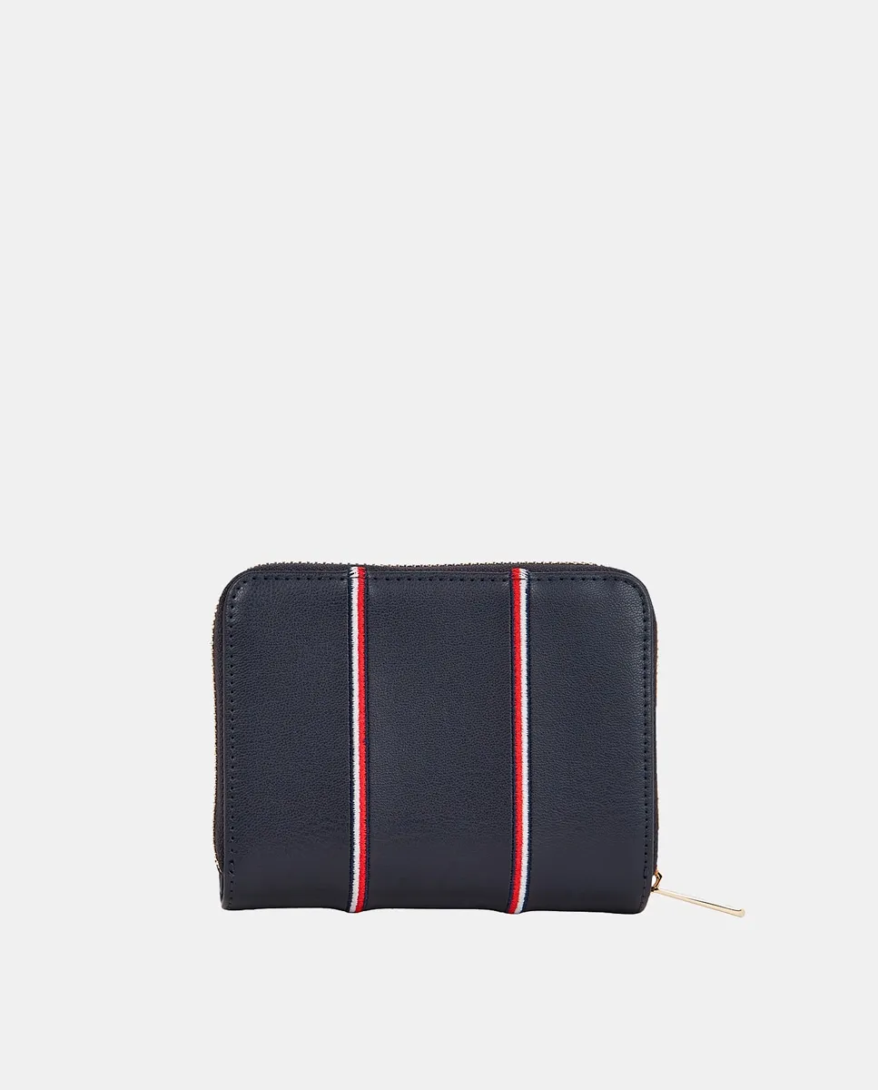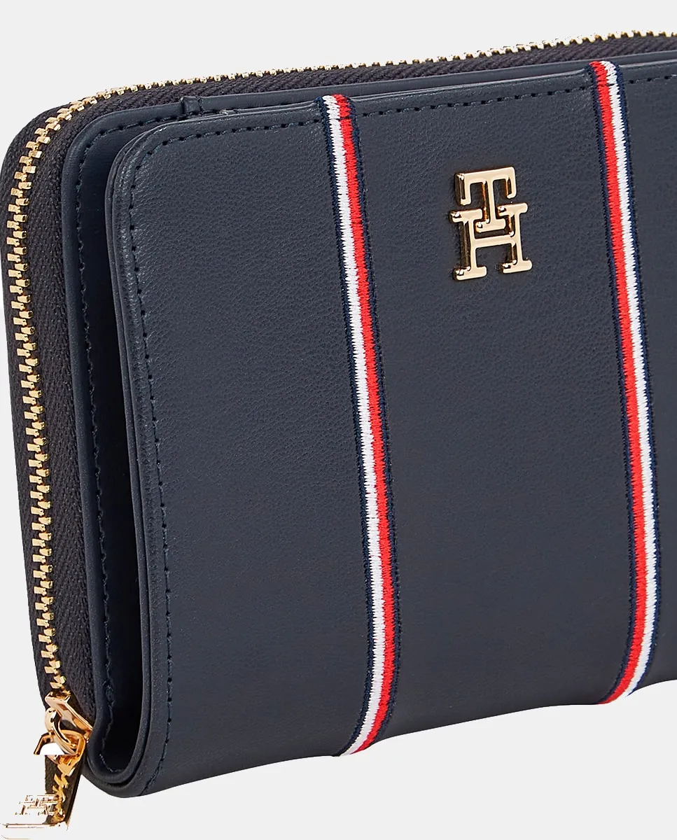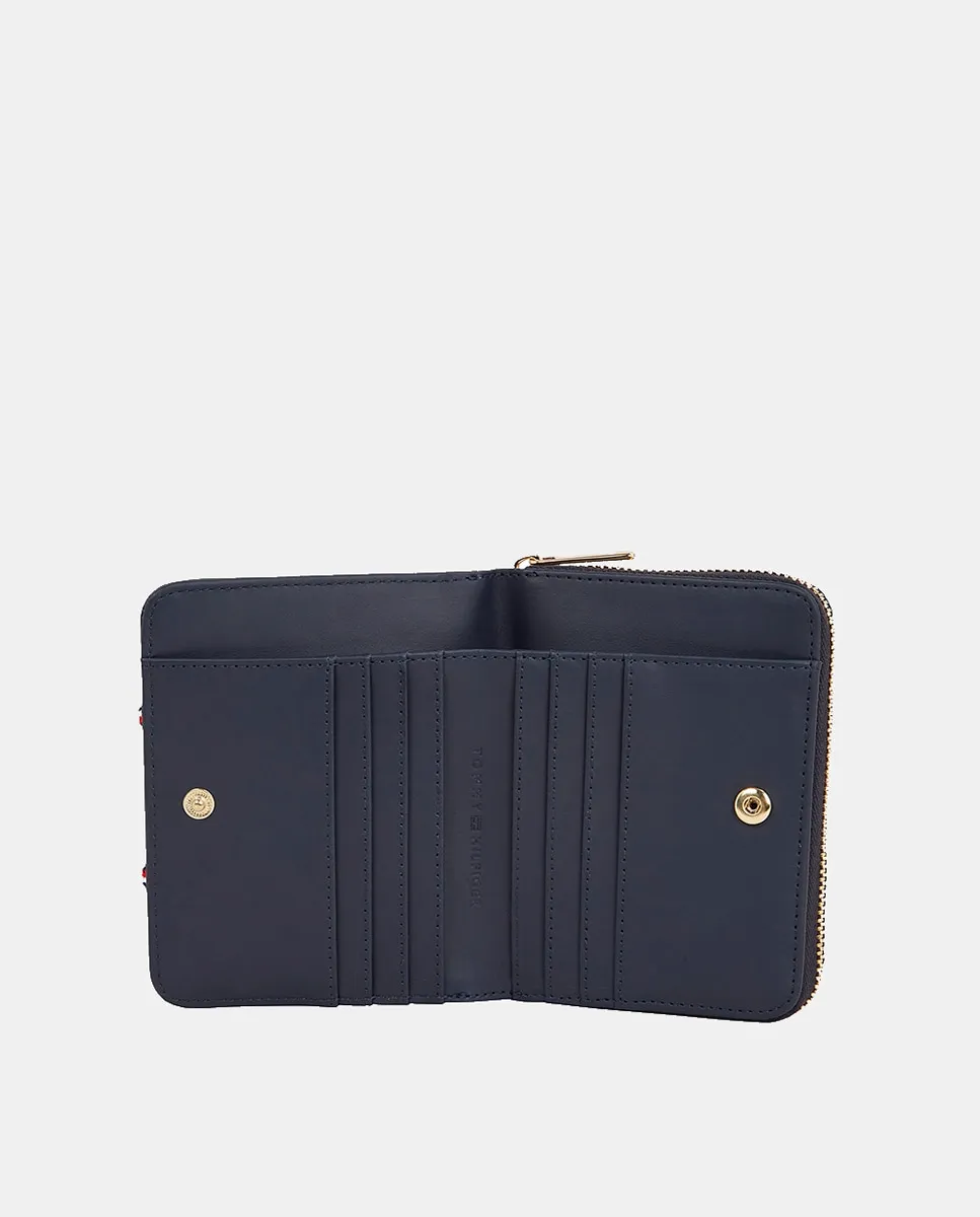 Средняя женская сумка из экокожи темно-синего цвета с корпоративными деталями. Дизайн включает отделение для купюр, держатель для карт и монетницу на молнии. С фронтальной стороны присутствует металлический логотип Tommy Hilfiger.