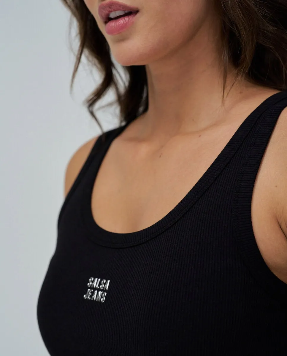 Этот базовый топ из ребристого трикотажа является незаменимым и сочетается с любыми вещами. Слим-крой и без рукавов идеально облегают тело, обеспечивая комфорт и современный вид. Круглый вырез придает образу непринужденность, а логотип на груди добавляет сдержанную, но выразительную деталь. Это вещь, которую легко сочетать с джинсами, шортами или юбками.- Базовый топ из ребристого трикотажа- Слим-крой- Круглый вырез- Без рукавов- Логотип на грудиДля справки: рост модели 1,74 м, на ней размер S.