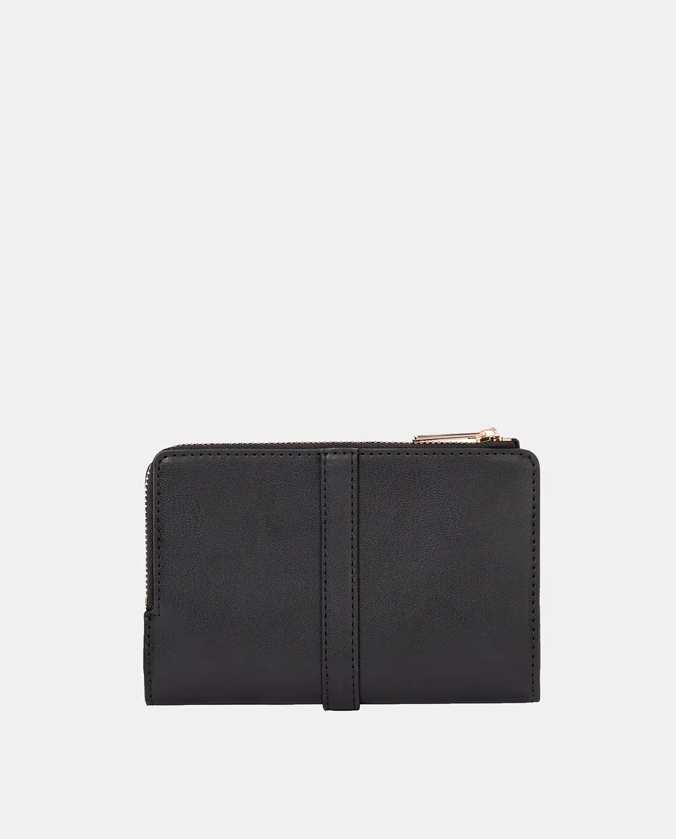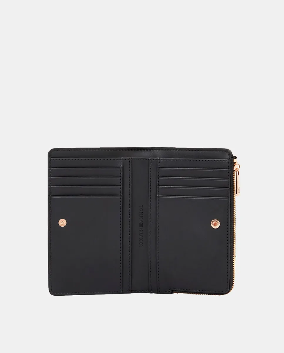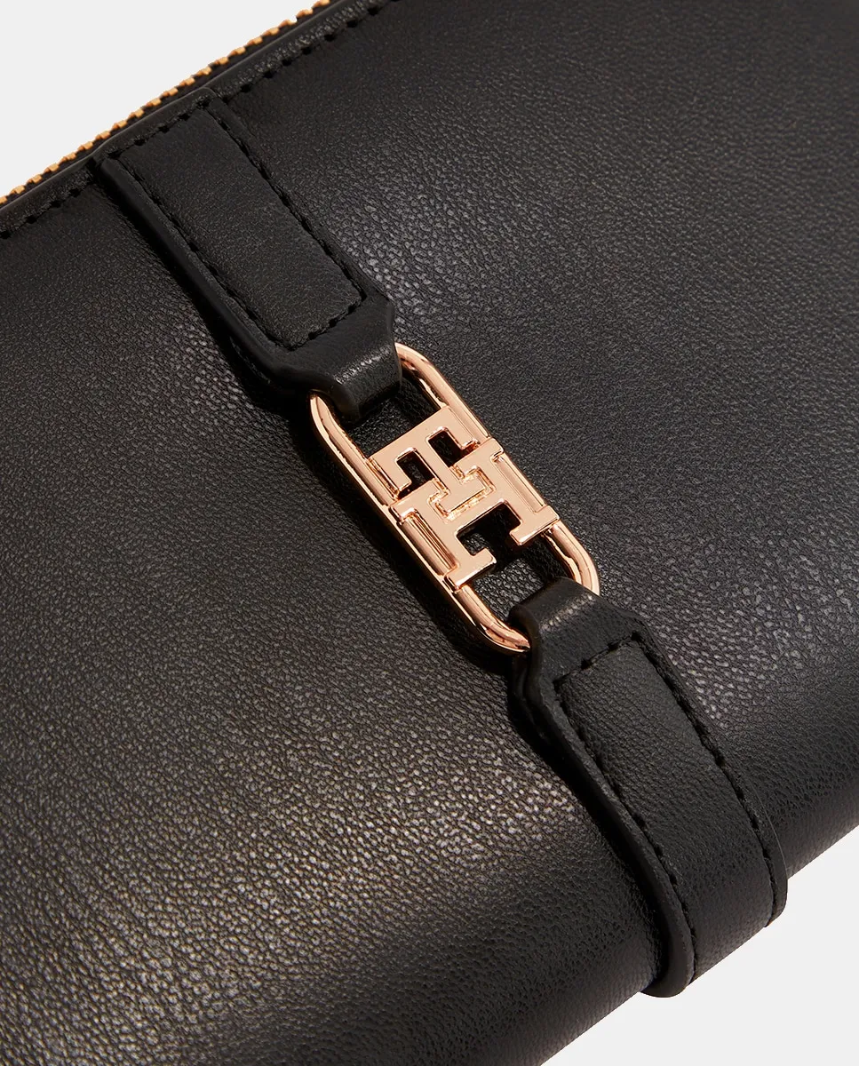 Женская сумка, выполненная из искусственной кожи черного цвета. Дизайн включает отделение для купюр, кошелек и отделение для монет на застежке-кнопке. Логотип Tommy Hilfiger из металла на застежке.