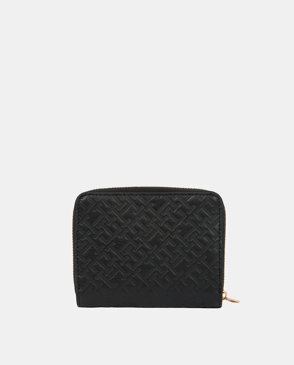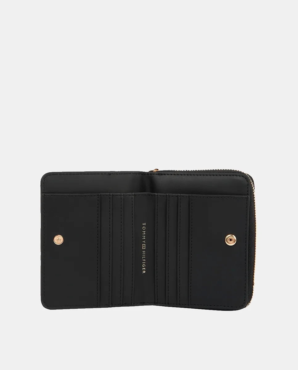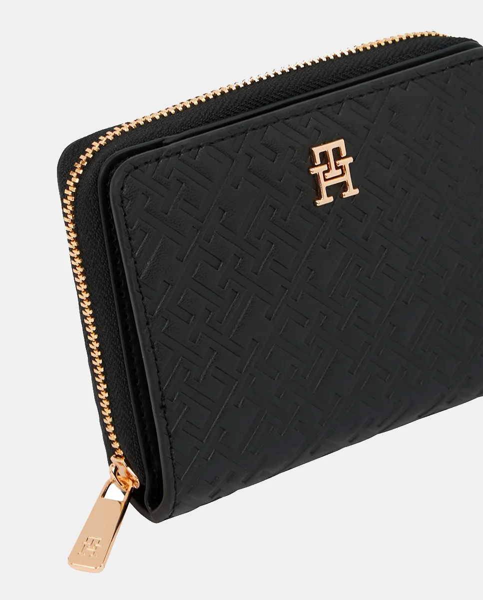 Средняя женская сумочка, изготовленная из экокожи черного цвета с монограммой TH. Дизайн включает отделение для купюр, кошелек для монет и держатель для карточек с застежкой-молнией. На передней части декоративный металлический логотип Tommy Hilfiger.