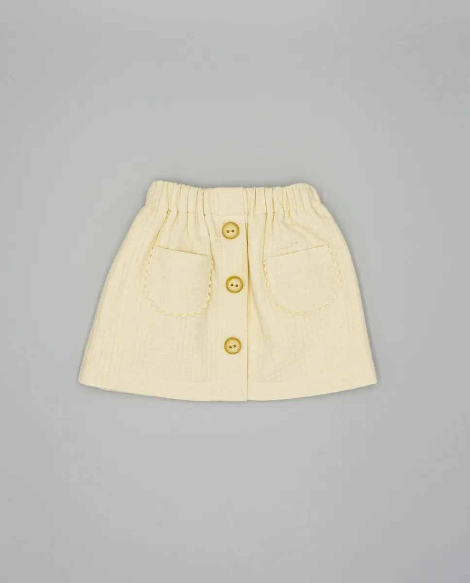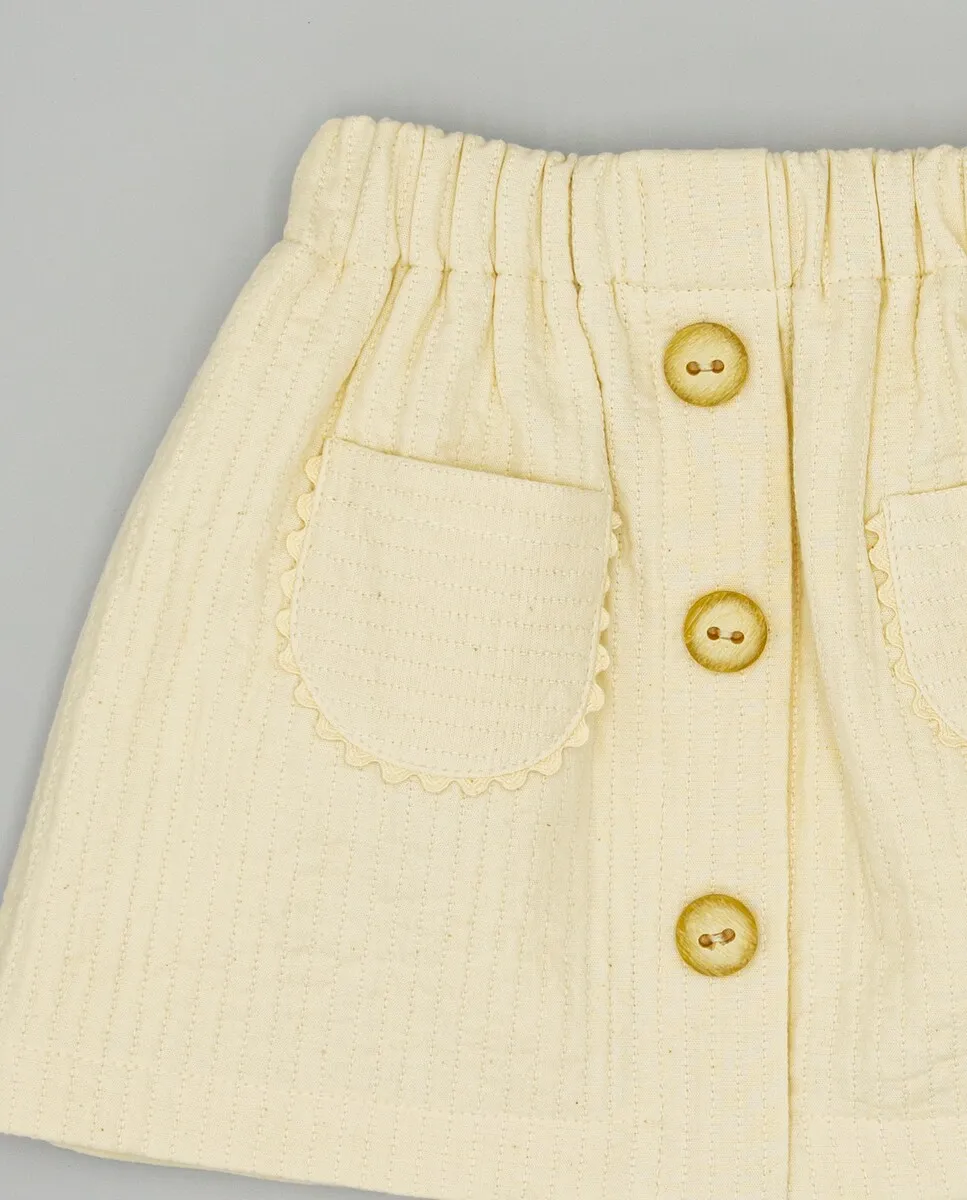 Бежевая юбка из 100% хлопка с текстурой для девочки, на хлопковой подкладке. С карманами с кантами из бежевой пикунелы. Спереди на пуговицах из уреа контрастного цвета. Доступно в размерах от 2 до 16 лет.