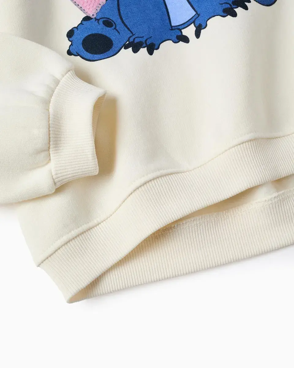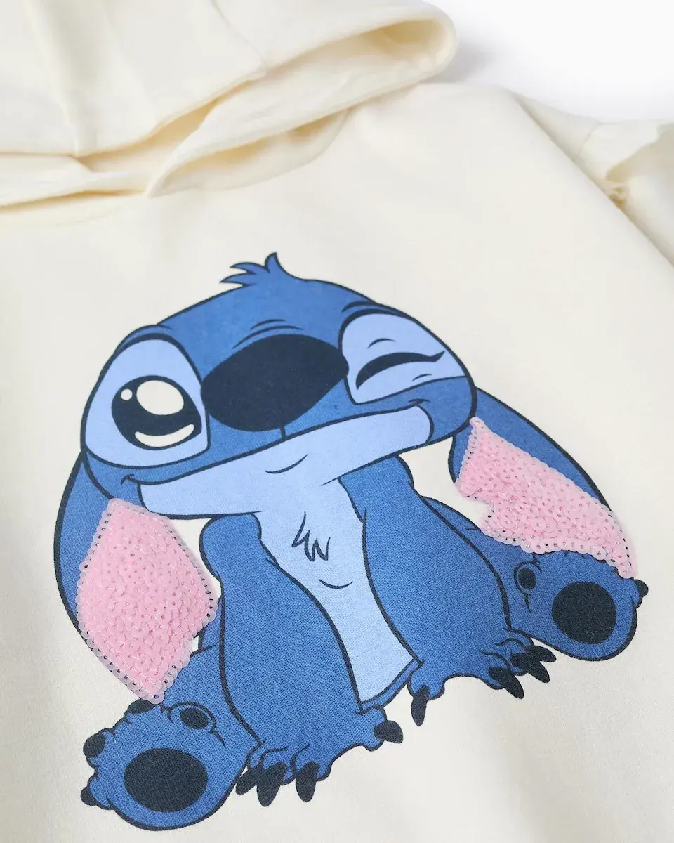 Бежевое худи с капюшоном для девочки, с мягкой внутренней отделкой для большего тепла. Принт Ститча с розовыми пайетками. Опущенные плечи с рюшами. Стянутые манжеты для идеальной посадки. Идеальное худи для фанаток Ститча!