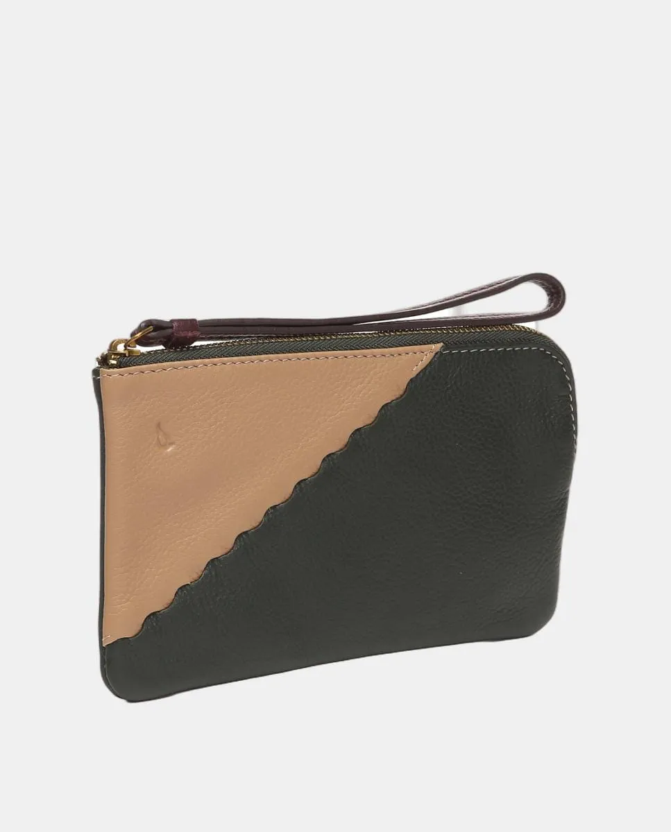 Женский несессер, выполненный из телячьей кожи, который сочетает два оттенка. Его дизайн выделяется волнистой полосой из кожи на передней части, добавляя элемент контрастности и оригинальности. Верхняя застежка на молнии и небольшая ручка. На передней части выдавлен логотип Abbacino.