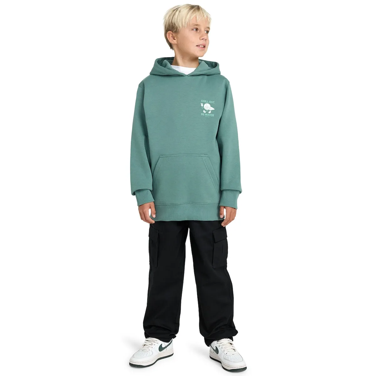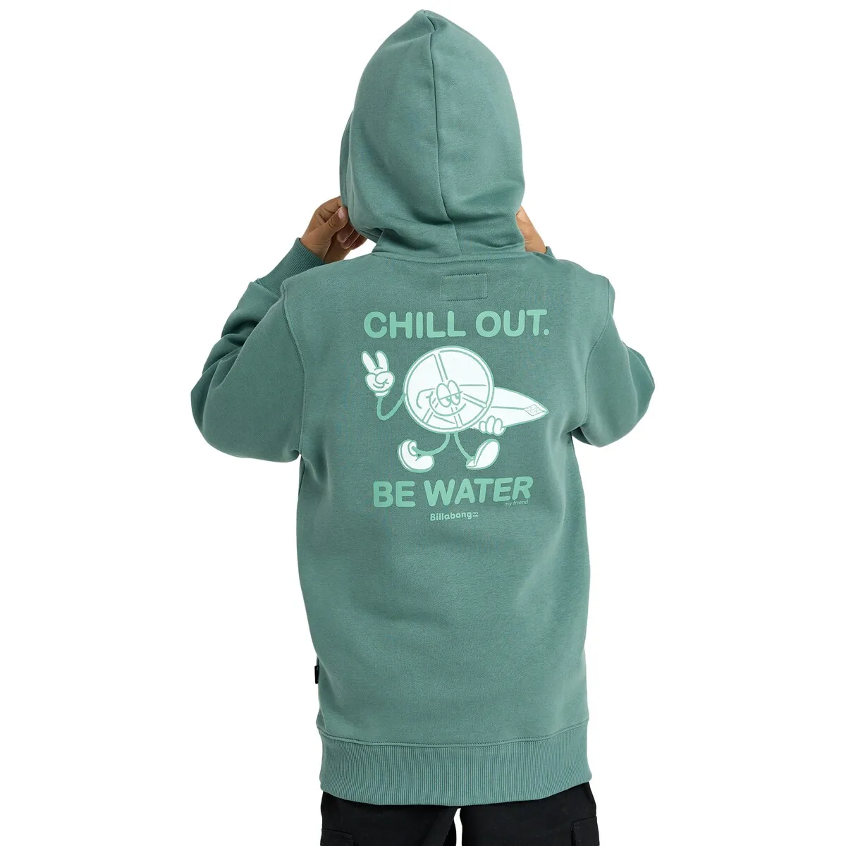 Толстовка с капюшоном для детей 8-16 лет. Особенности включают: Ткань: смесь переработанного хлопка и полиэстера 280 г/м², шелкография на груди и спине, внутренний слой без начеса, карманы-кенгуру, изделие прошедшее стирку для большей мягкости и этикетка Billabong на боковом шве.