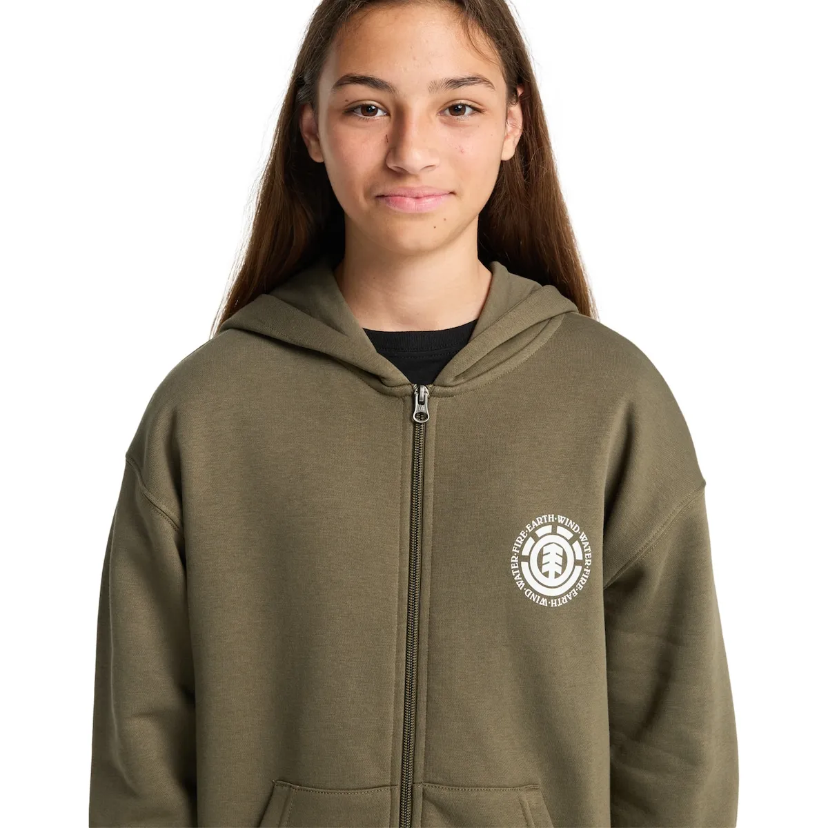 Толстовка с капюшоном и молнией для детей 8-16 лет. Характеристики включают: Ткань: обычный хлопок с переработанным хлопком и полиэстером [280 г/м2], обычный крой, флисовая отделка, мягкая внутренняя поверхность, широкий карман, капюшон с подкладкой из однослойного трикотажа, водные принты на груди и спине, прямоугольная фирменная этикетка.