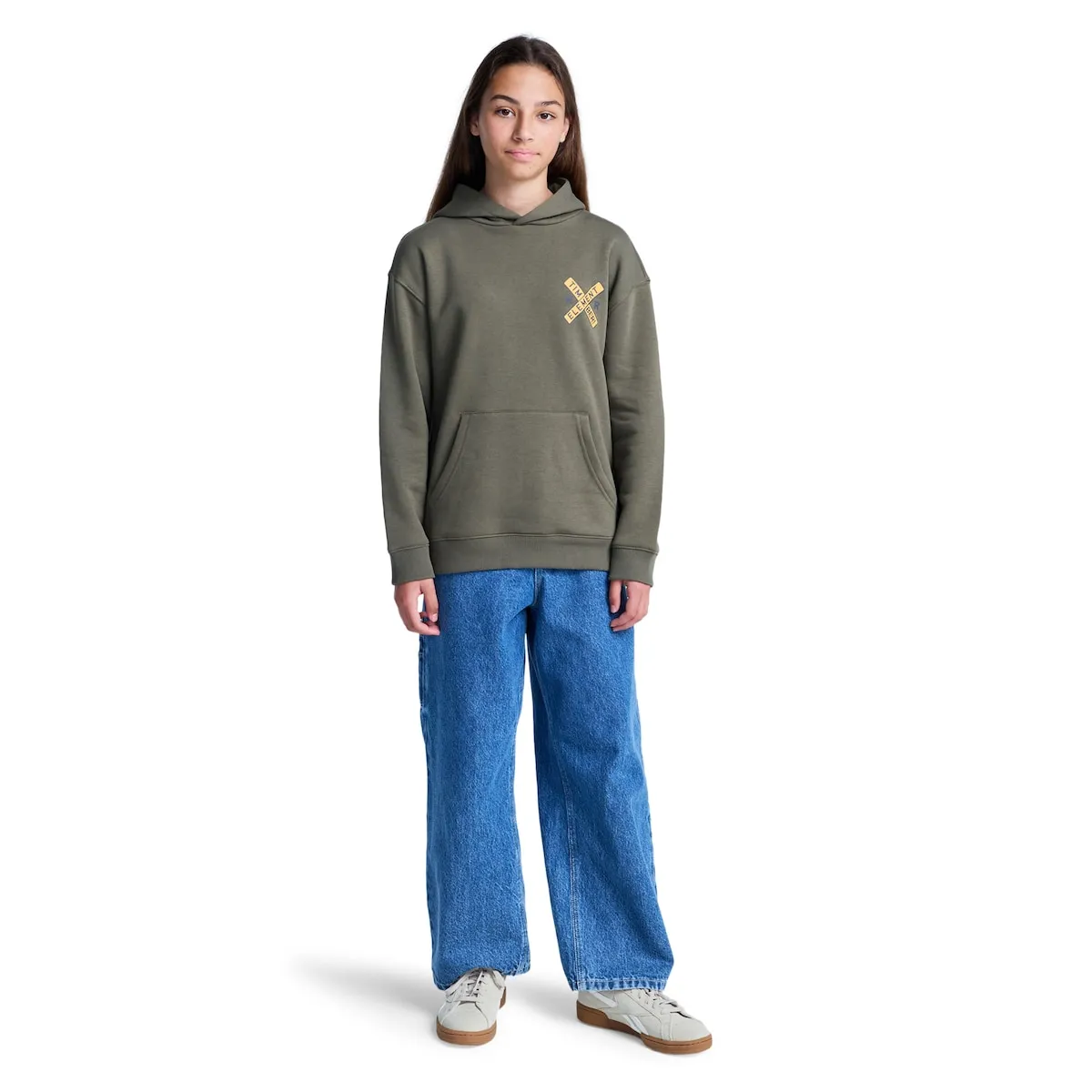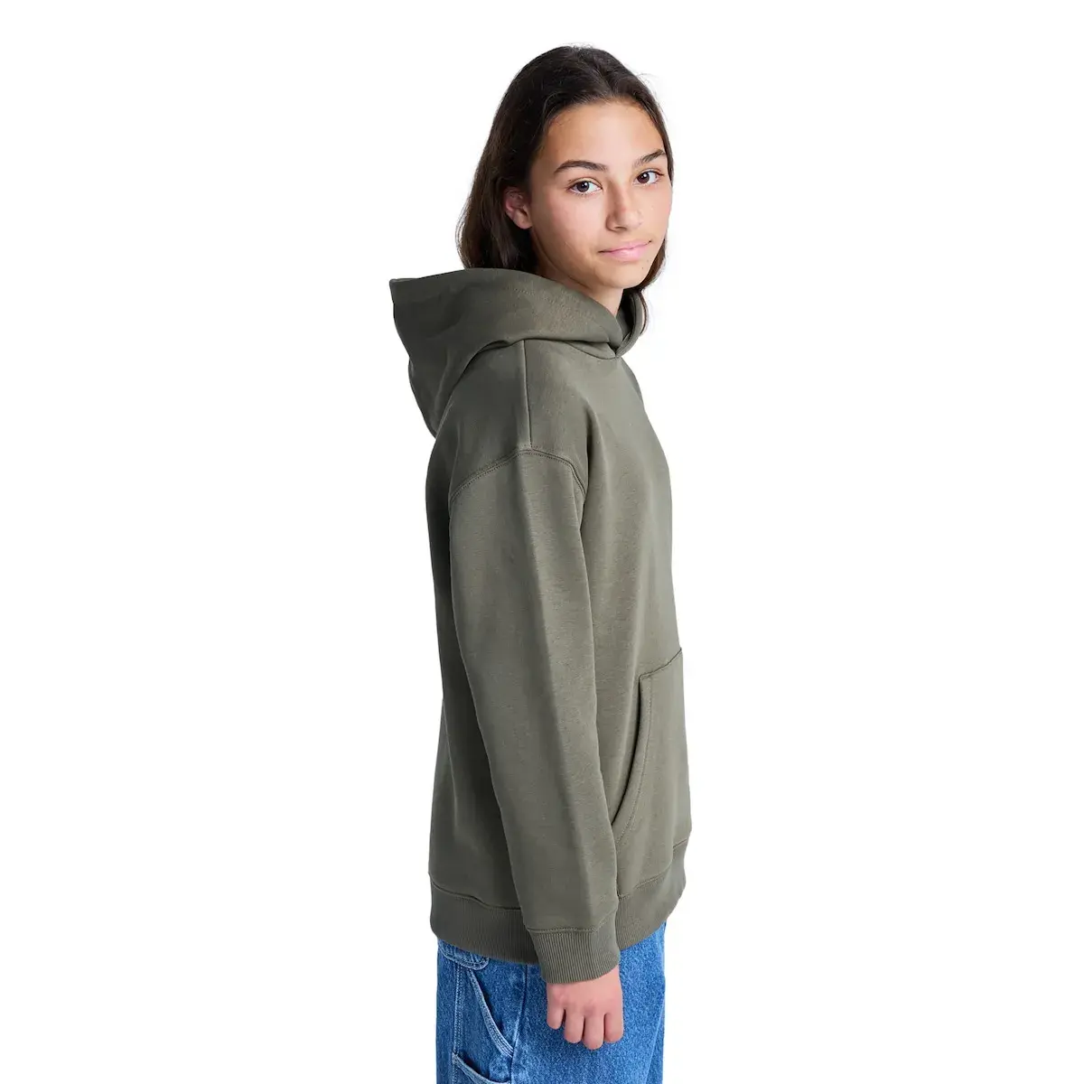 Толстовка с капюшоном для детей 8-16 лет. Особенности включают: Ткань: обычный хлопок с переработанным хлопком и полиэстером [280 г/м²], стандартный крой, флисовая отделка, внутренний слой с ворсом, широкий карман, капюшон на подкладке из однослойного джерси, принты на водной основе на груди и спине, прямоугольная фирменная этикетка.
