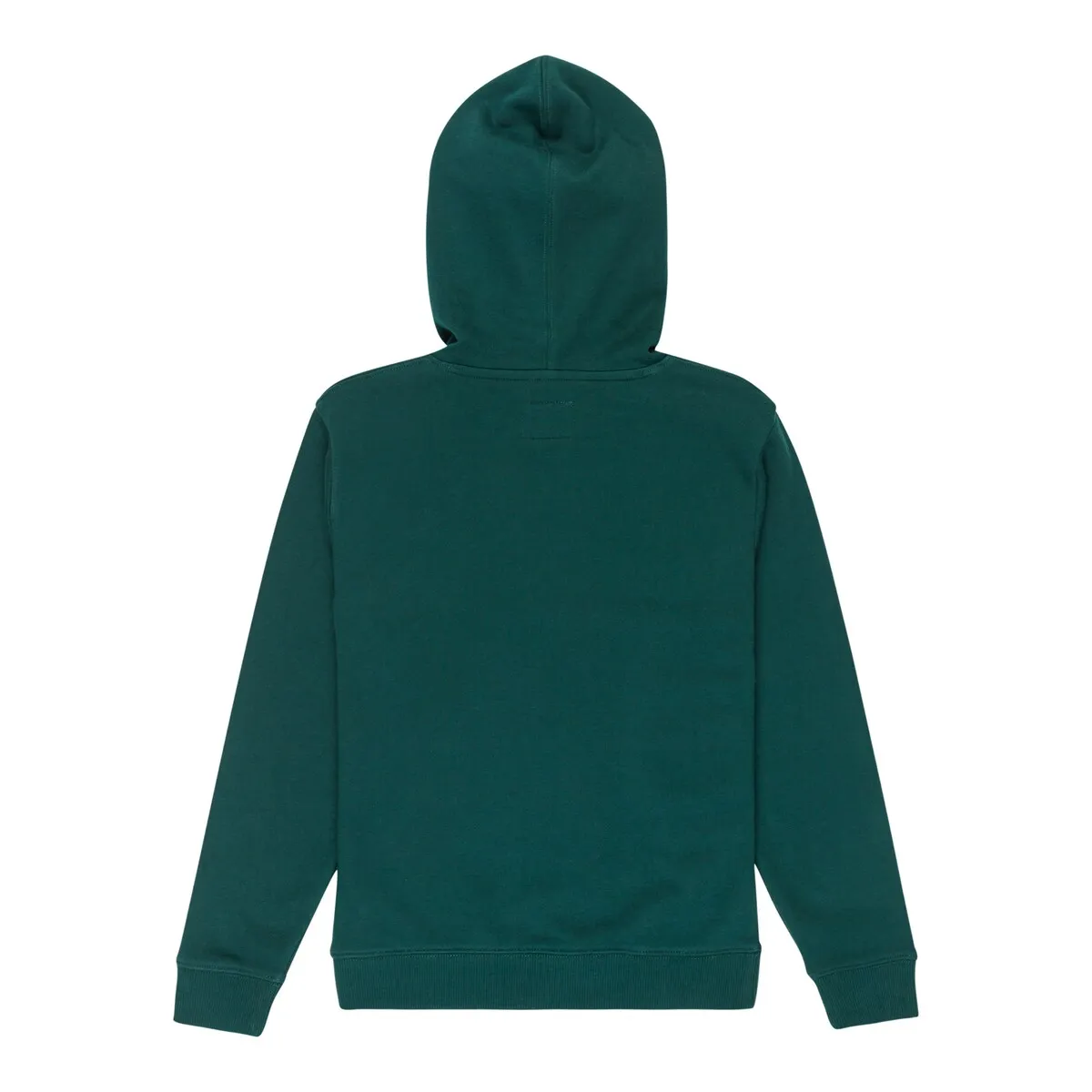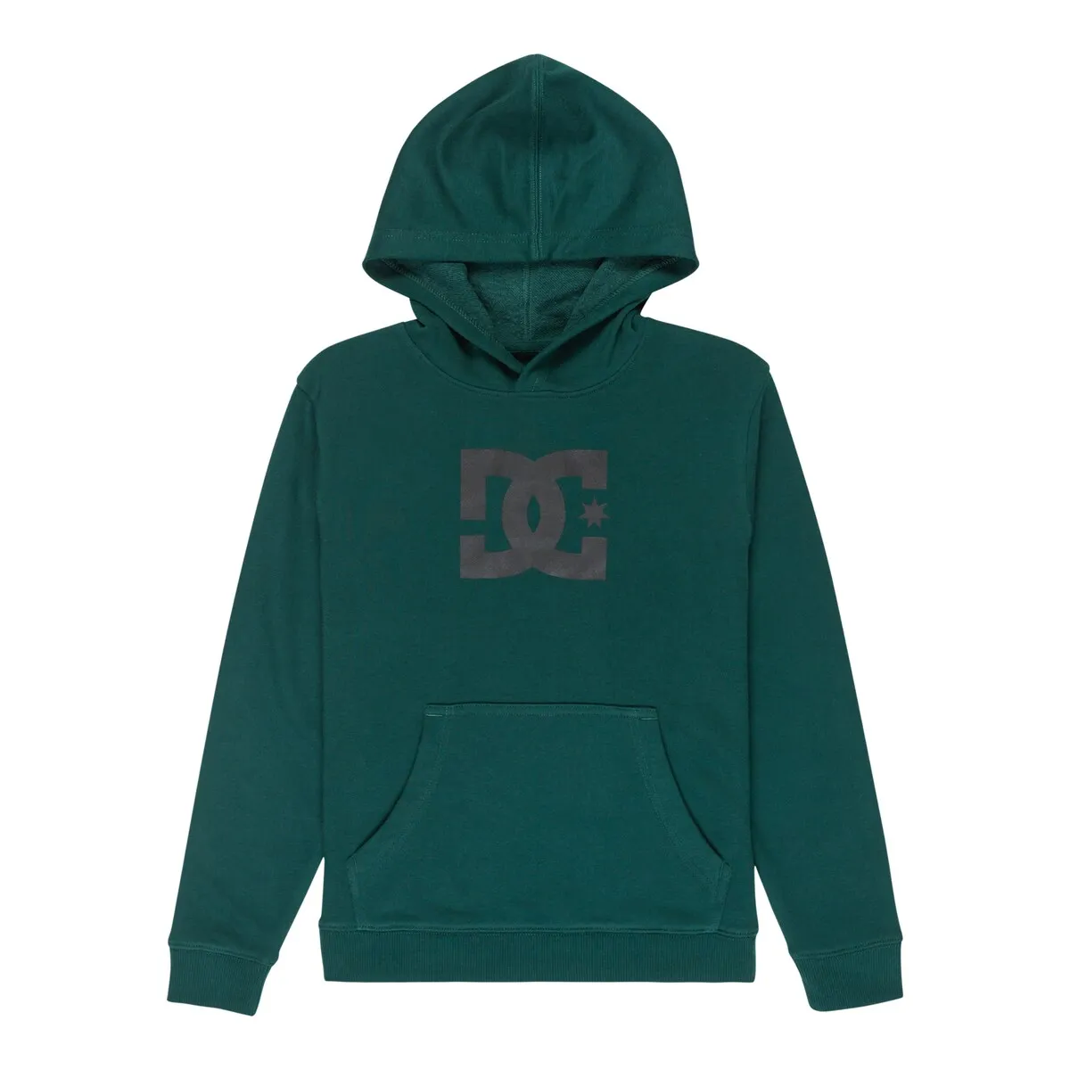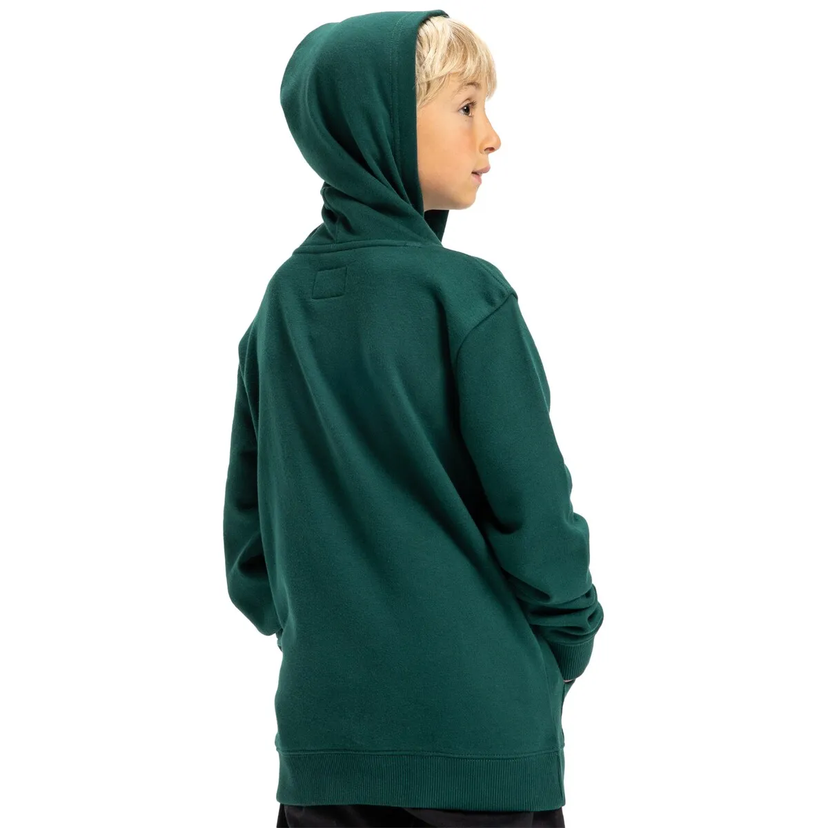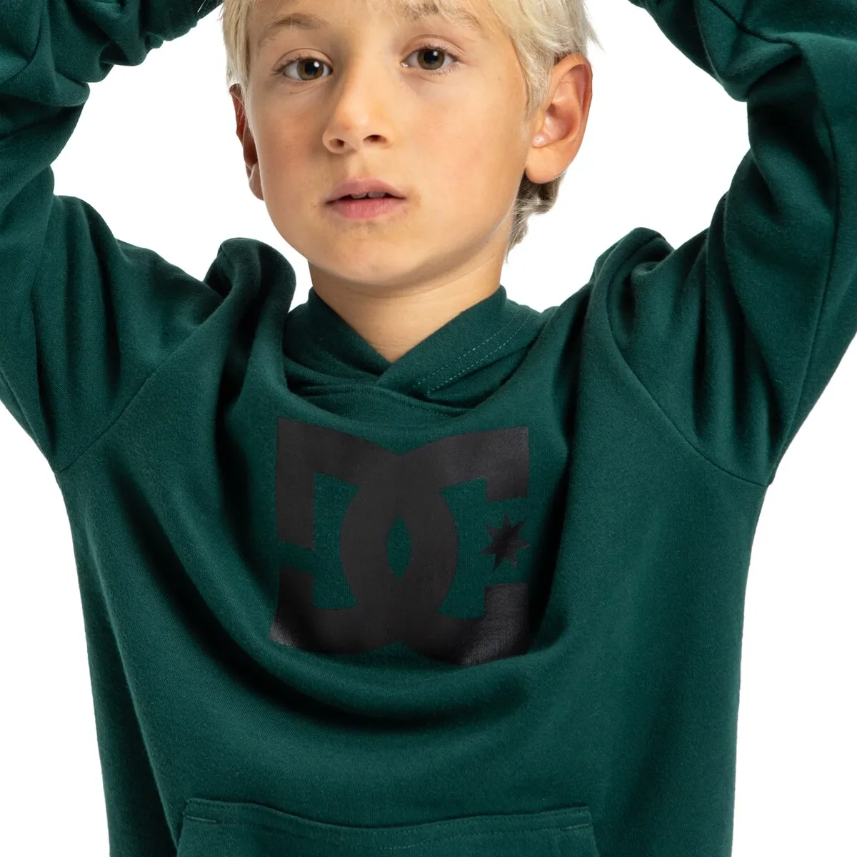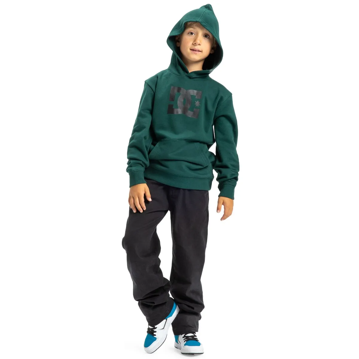Толстовка с капюшоном для детей 8-16 лет. Характеристики включают: Ткань: французский махровый трикотаж с полустрлщеной внутренней стороной из хлопка средней плотности, переработанного хлопка и переработанного полиэстера [280 г/м²], стандартный крой, карманы-кенгуру, центровые принты из пластизола на передней части, лента с зигзагообразным переплетением на задней части воротника и детали DC RE и SOLVE.