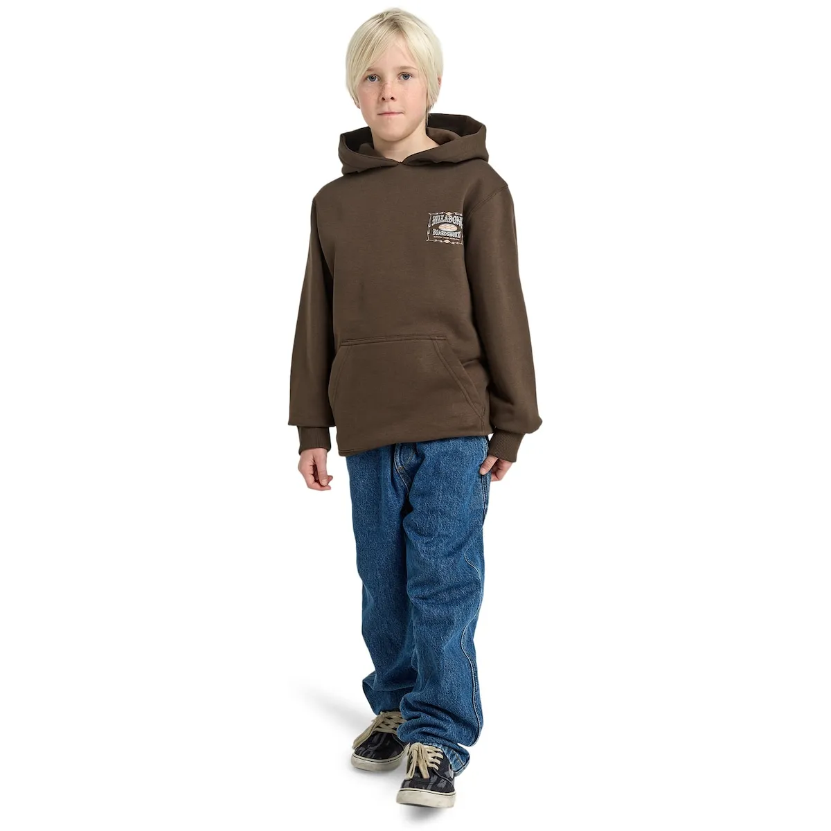 Толстовка с капюшоном для детей 8-16 лет. Особенности включают: Ткань: смесь переработанного хлопка и полиэстера 280 г/м², шелкография на груди и спине, внутренний слой без начеса, карманы-кенгуру, изделие прошедшее стирку для большей мягкости и этикетка Billabong на боковом шве.