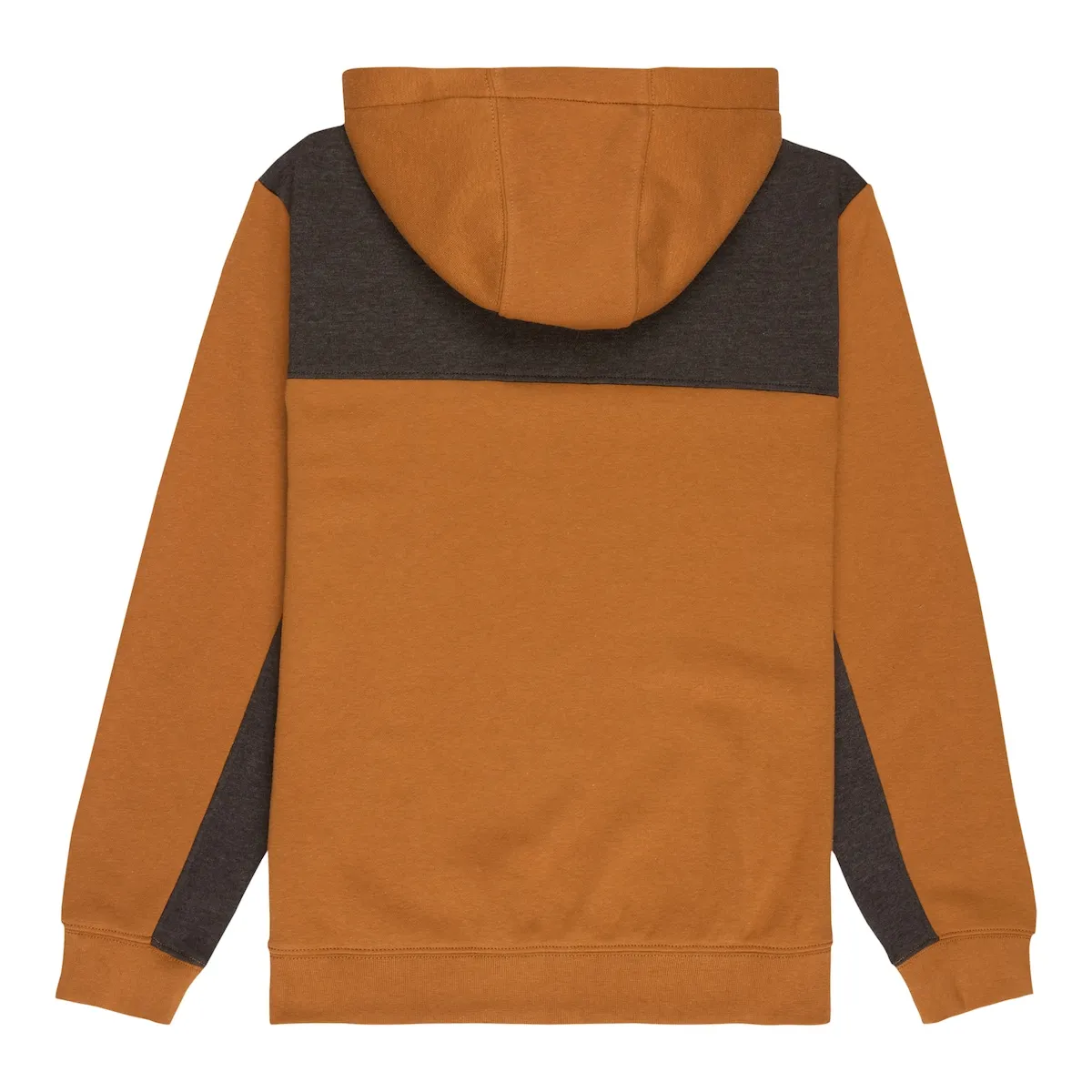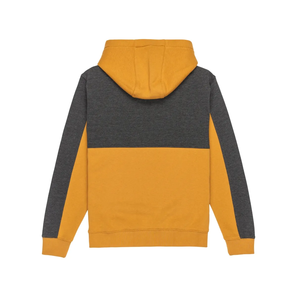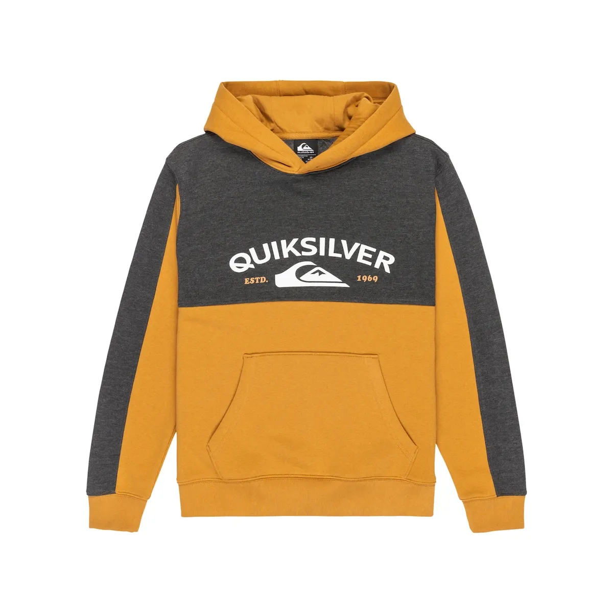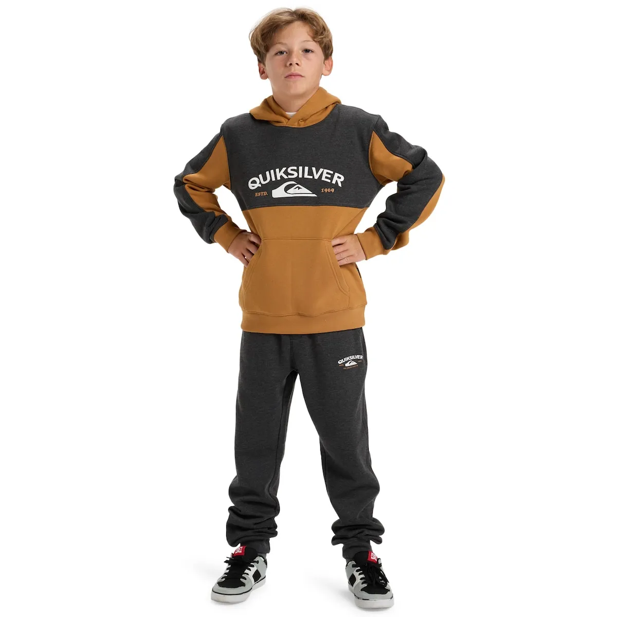 Толстовка с капюшоном для детей 8-16 лет. Характеристики включают: Материал: органический хлопок, переработанный полиэстер, Вес: 280 г/м², Внутренняя подкладка: ткань с начесом, Крой: обычный, Капюшон: с капюшоном, Манжеты: ребристая 1x1 на рукавах и нижнем крае, Карманы: кенгуру, Цветовые блоки с художественными деталями на груди и Бренд: набор переработанных этикеток Quiksilver.