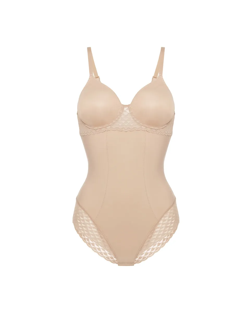 Боди из кружева и сетки с полужесткой поддержкой ++, разглаживающий живот. Минимизатор: формирует грудь, уменьшает ее объем без сжатия. Боди из моделирующей сетки с подкладкой спереди для скульптурного эффекта. Кружева на верхней части бедер для большей женственности. Вырез на спине, украшенный кружевными каймами по линии ягодиц. Регулируемые и многопозиционные бретели. Подкладка 100% хлопок.