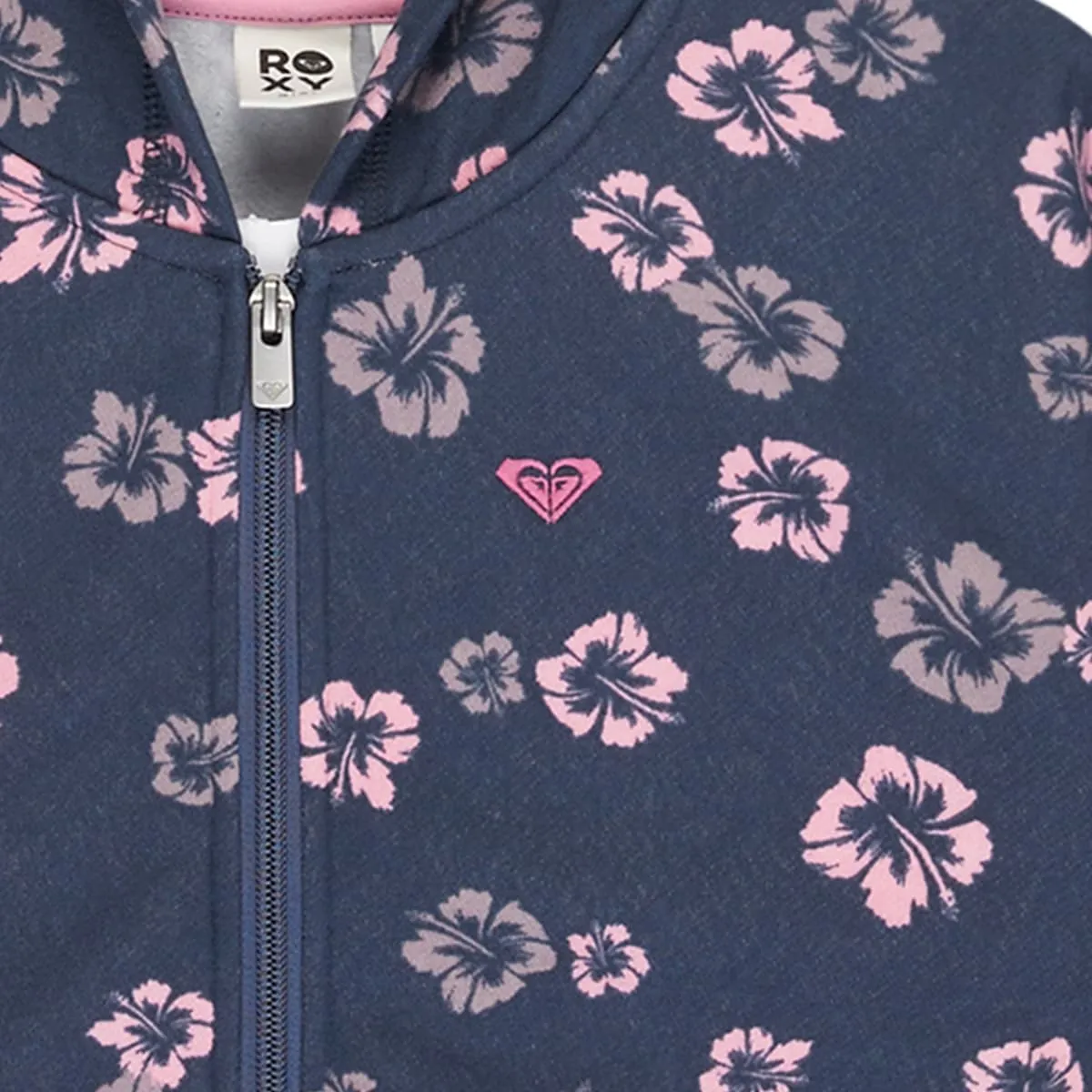 Толстовка с капюшоном и молнией для детей 4-16 лет. Характеристики включают: Ткань: флисовая смесь хлопка и полиэстера [230 г/м²], Крой: свободный, Карманы-кенгуру и вышивка Roxy на груди.