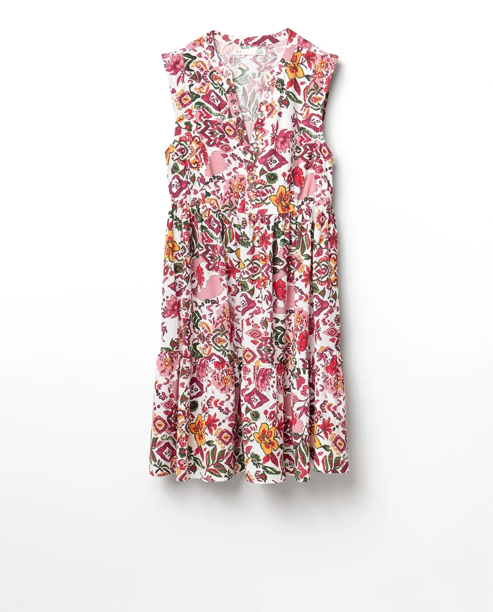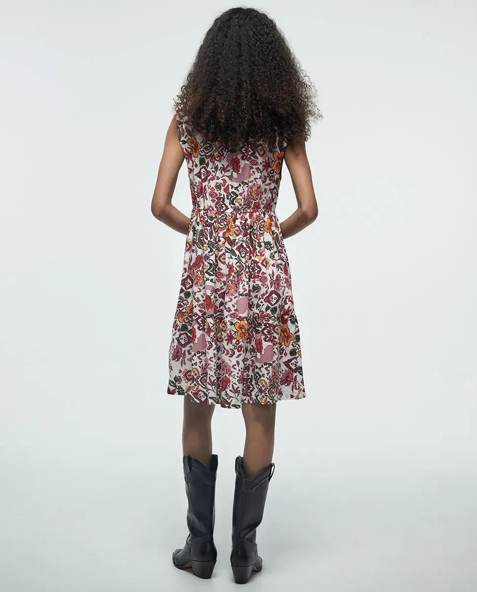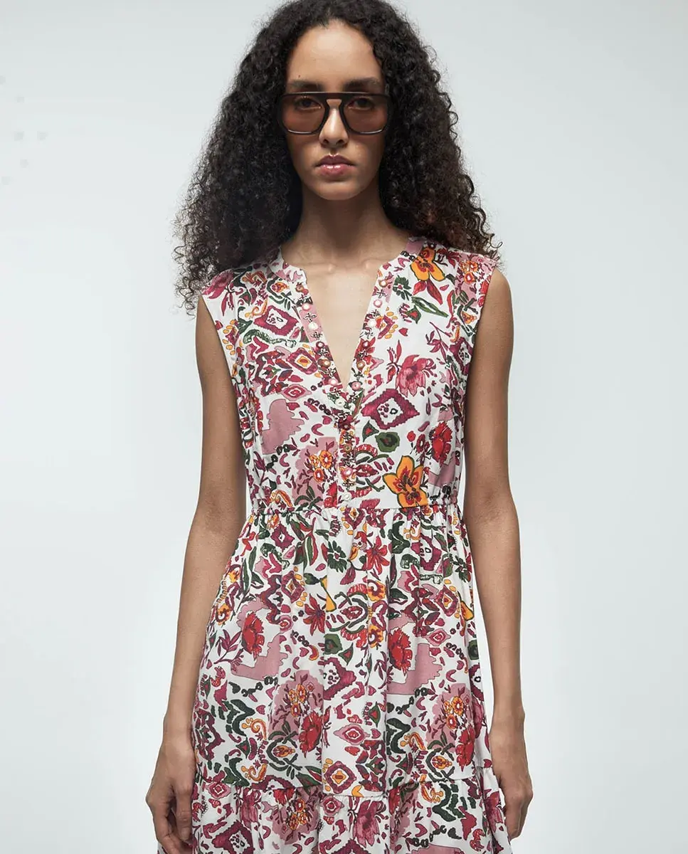 Короткое платье с принтом, без рукавов и V-образным вырезом. Детали с зеркалами на вырезе.