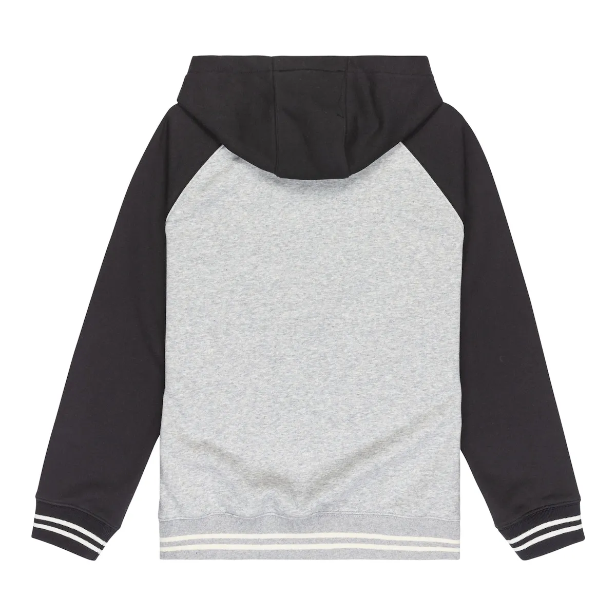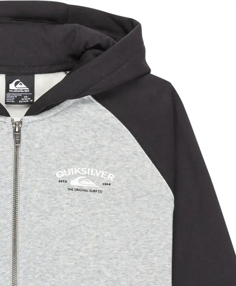 Толстовка с капюшоном и застежкой-молнией для детей 8-16 лет. Характеристики включают: Ткань: органический хлопок, переработанный полиэстер, Вес: 280 г/м², Подкладка: ткань с начесом, Крой: обычный, Капюшон: капюшон, Планка: 1x1 на манжетах и подоле с заостренным краем, Рукава: реглан, Карманы: карман-кенгуру, Цветовые блоки с художественными деталями на груди и Бренд: упаковка с переработанными ярлыками Quiksilver.
