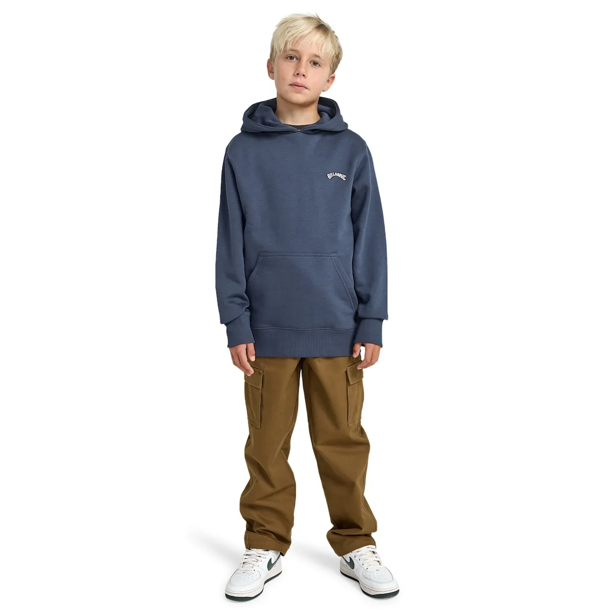 Толстовка для детей 8-16 лет. Характеристики включают: Материал: флисовая ткань с двойным окрашиванием из переработанного хлопка и полиэстера, 280 г/м², внутренняя сторона с начесом, вышивка логотипа 'Arch' Billabong на груди и тканая этикетка.