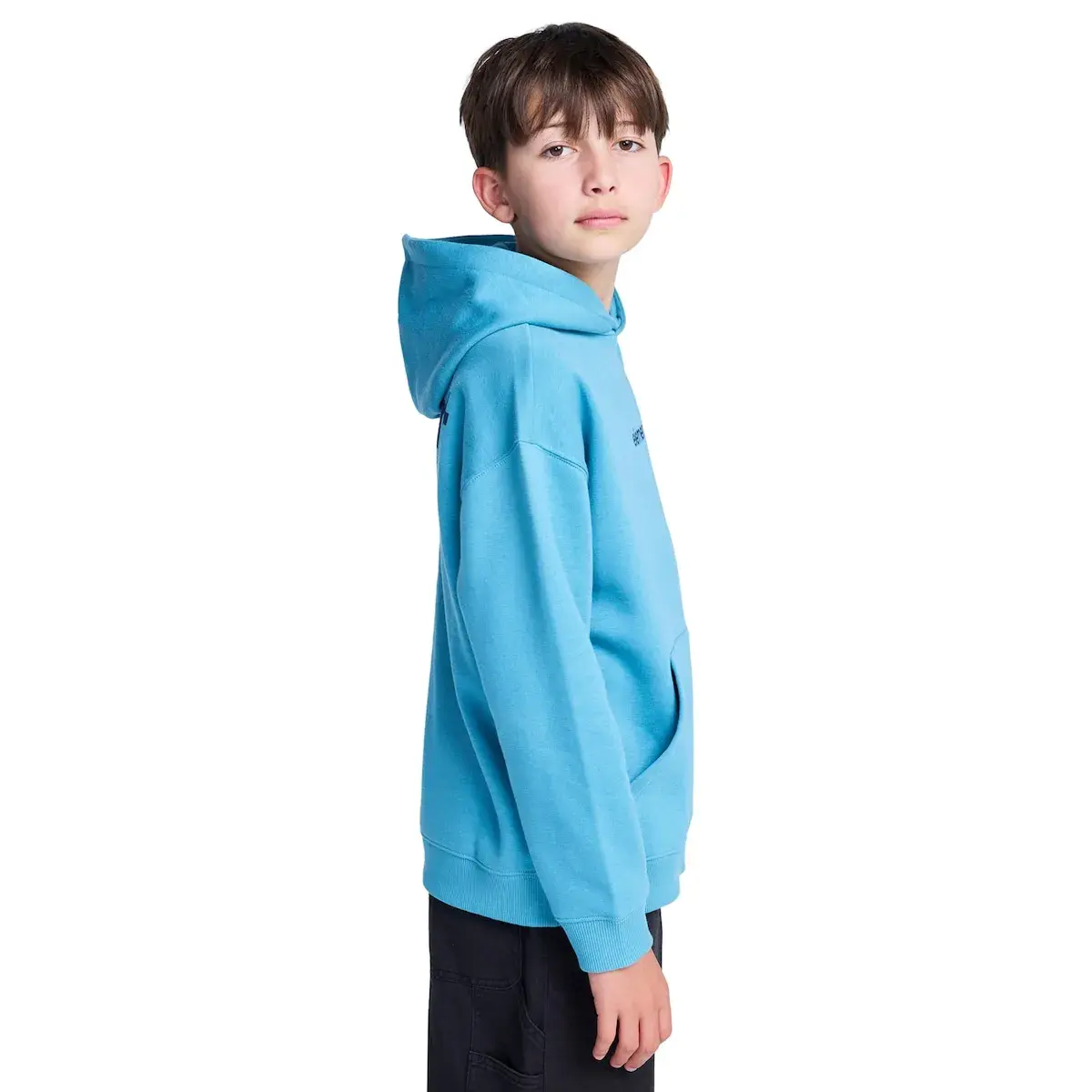 Толстовка с капюшоном для детей 8-16 лет. Особенности включают: Ткань: обычный хлопок с переработанным хлопком и полиэстером [280 г/м²], стандартный крой, флисовая отделка, внутренний слой с ворсом, широкий карман, капюшон на подкладке из однослойного джерси, принты на водной основе на груди и спине, прямоугольная фирменная этикетка.