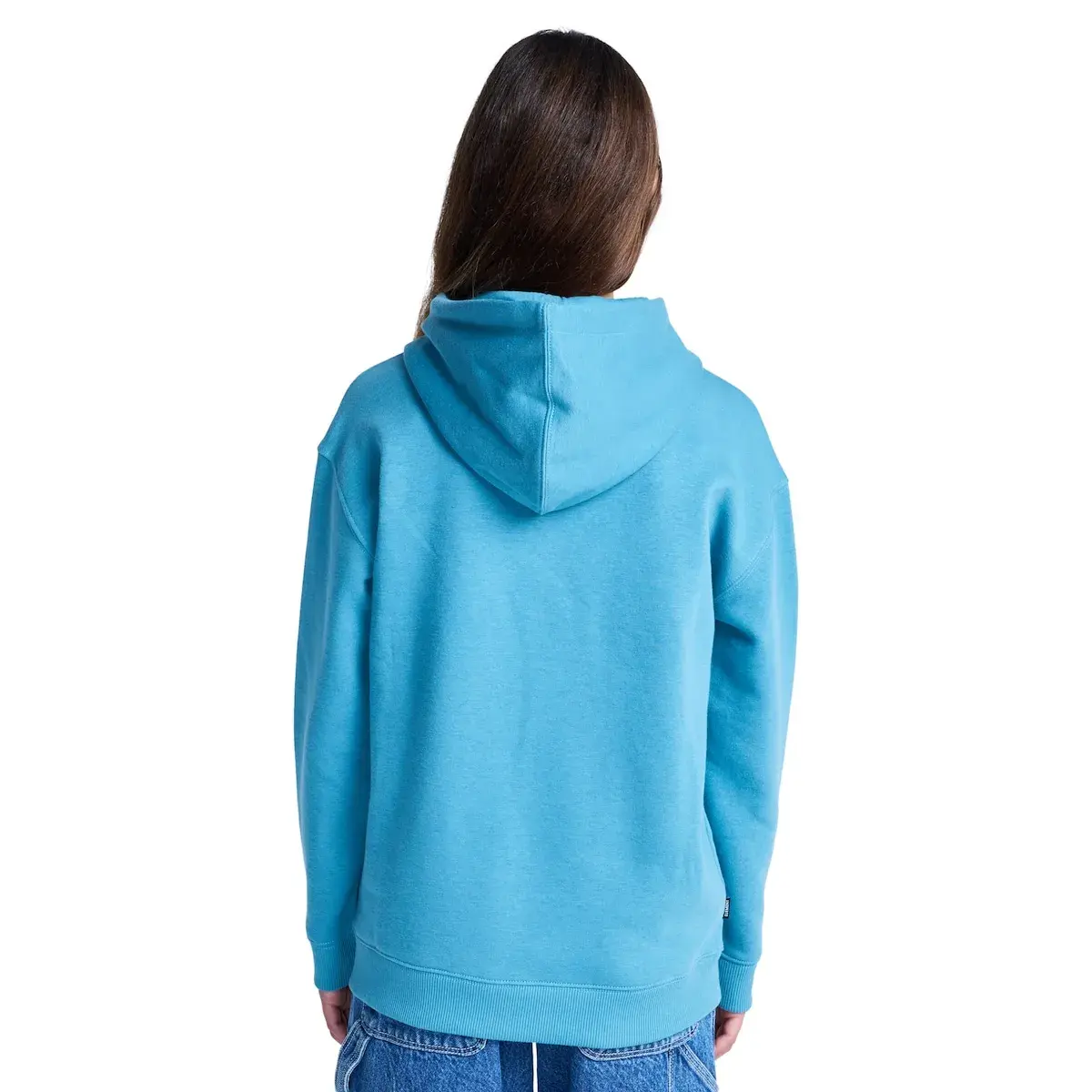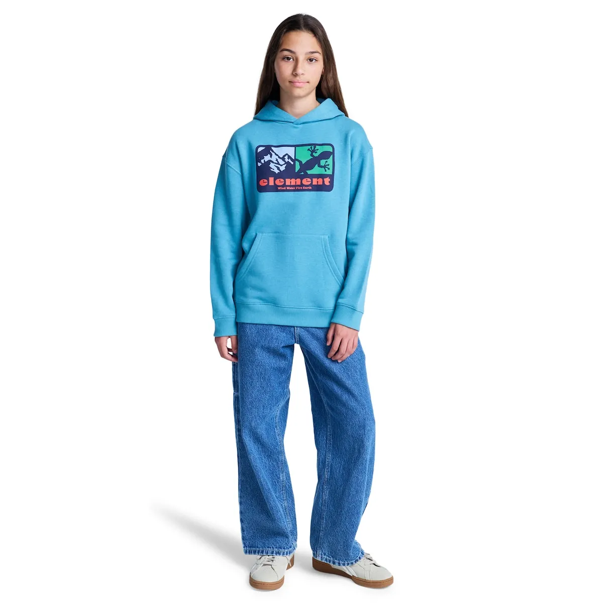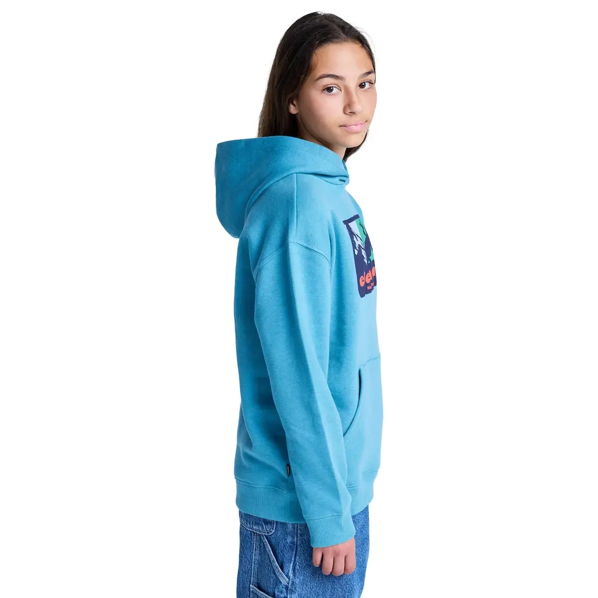 Толстовка с капюшоном для детей 8-16 лет. Характеристики включают: Conscious by Nature: переработанный хлопок, Ткань: обычный хлопок с переработанным хлопком и полиэстером [280 г/м2], Крой: обычный, Конструкция: французский махровый трикотаж, Внутренняя часть: щеточная отделка, Карманы: кенгуру, Капюшон: подкладка из трикотажа, Принт: принт на водной основе на передней части, Бренд: прямоугольная этикетка.