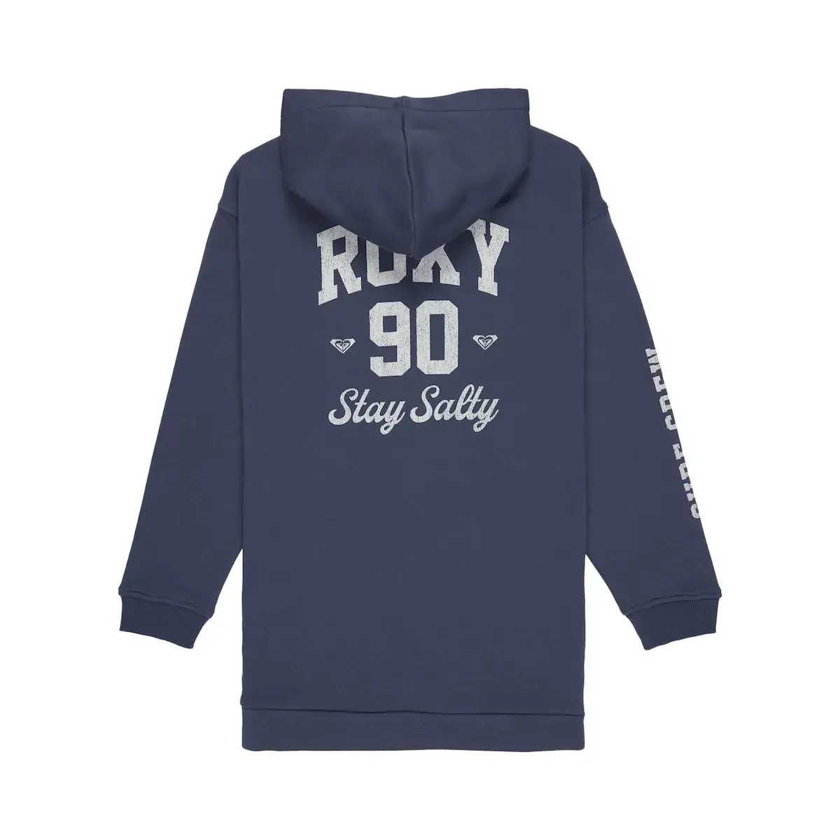 Толстовка-платье для детей 4-16 лет. Особенности включают: Ткань: ткань с начесом из хлопка и полиэстера [280 г/м²], Крой: свободный, Воротник: худи, Рукава: длинные рукава, Винтажные детали Roxy спереди, на спинке и на рукавах.