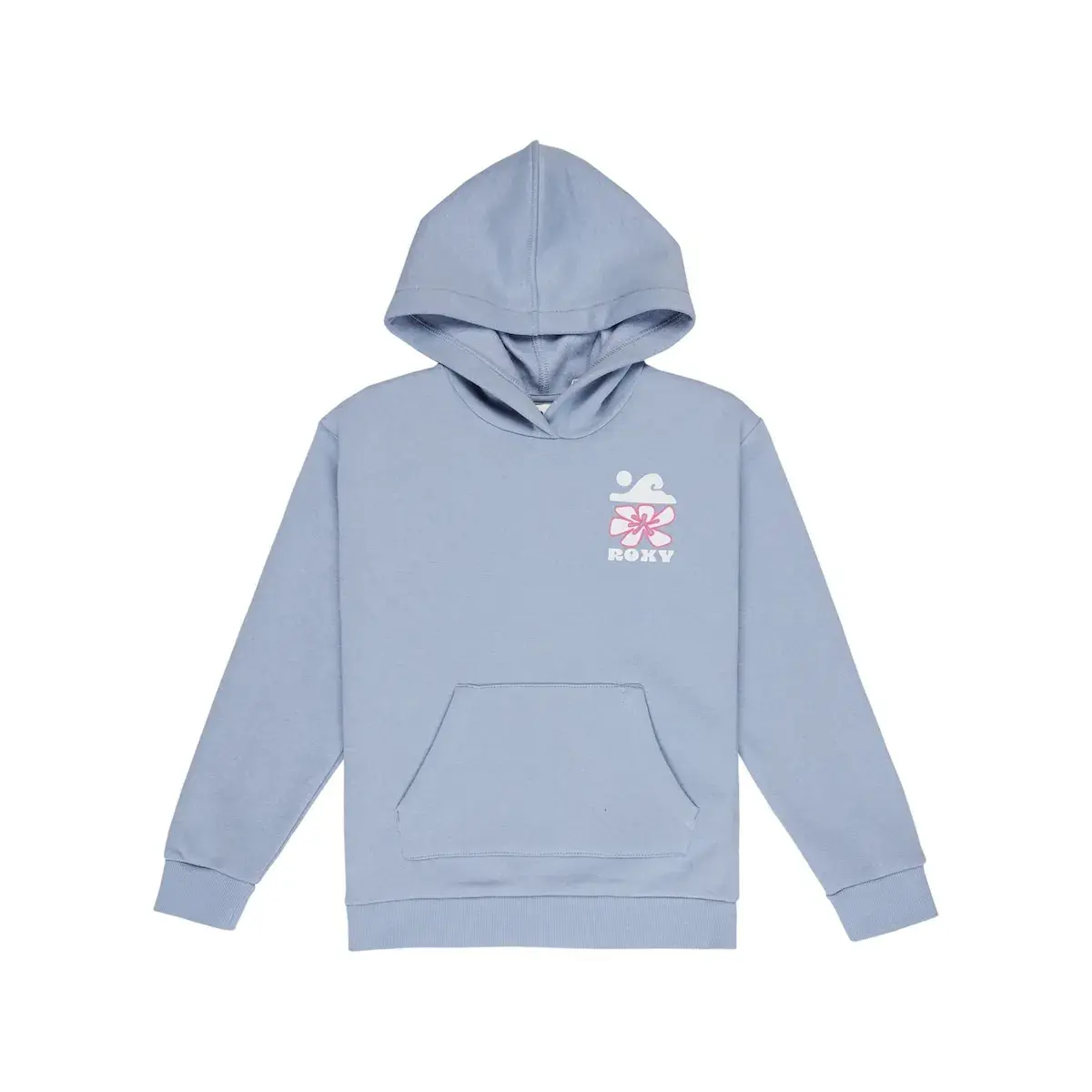 Толстовка с капюшоном для детей 4-16 лет. Особенности включают: Ткань: флисовая смесь хлопка и полиэстера [280 г/м2], Крой: свободный, Воротник: толстовка с капюшоном, Большой карман и Художественные детали Roxy на передней части и рукавах.
