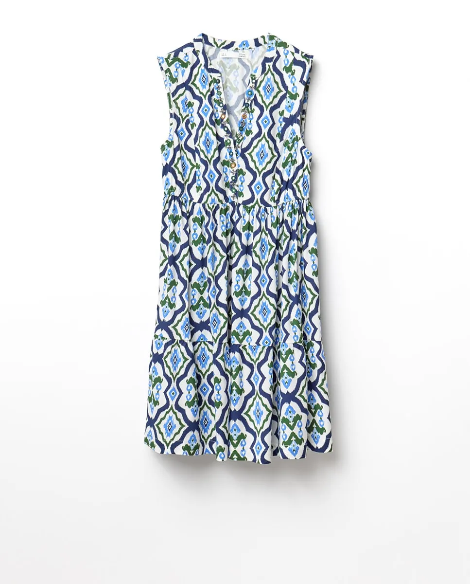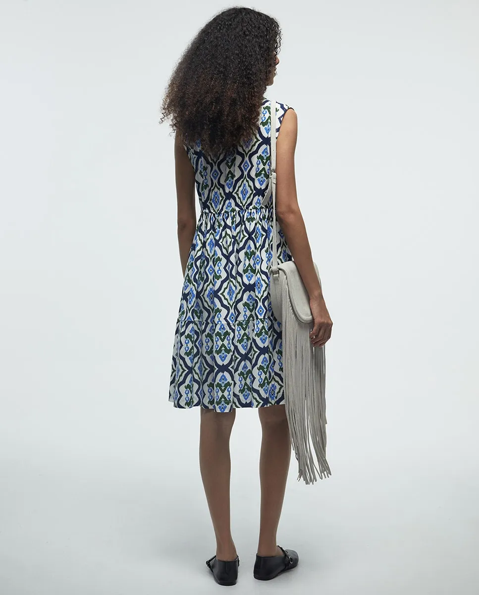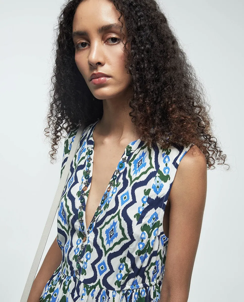 Короткое платье с принтом, без рукавов и V-образным вырезом. Детали с зеркалами на вырезе.