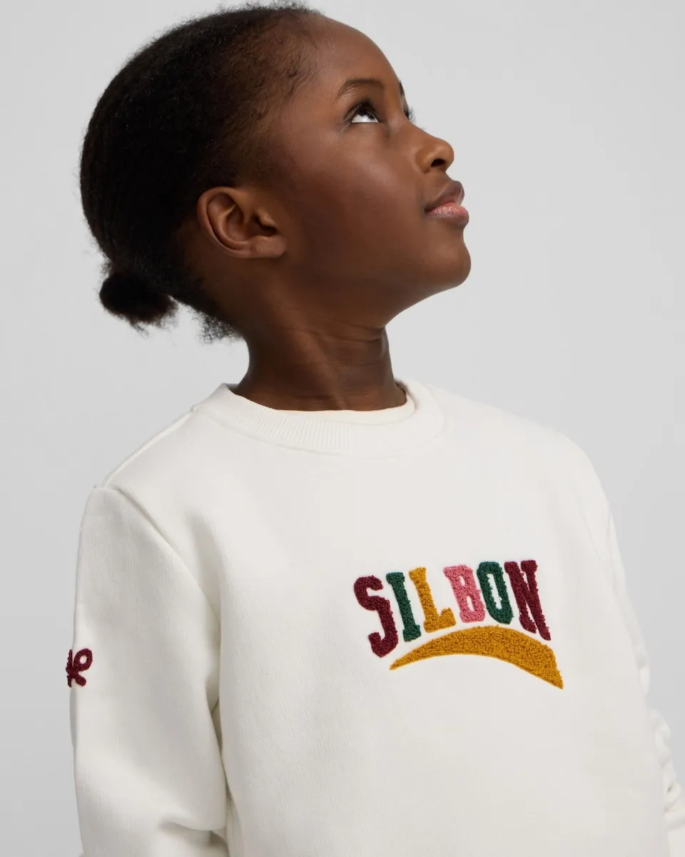 Белая толстовка с вышитыми буквами Silbon на разноцветном махровом полотне и контрастной деталью в виде ракеток Silbon бордового цвета на рукаве. Круглый вырез и прямые рукава с манжетами. Стандартный крой.