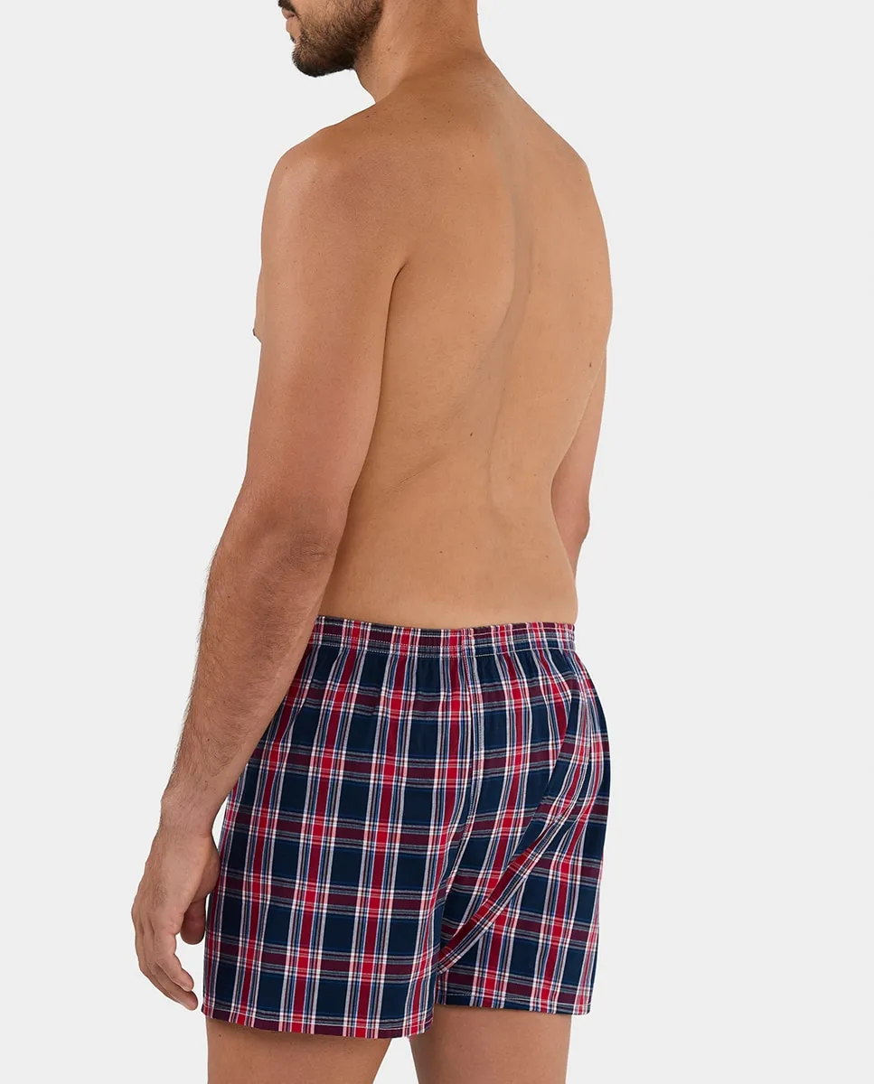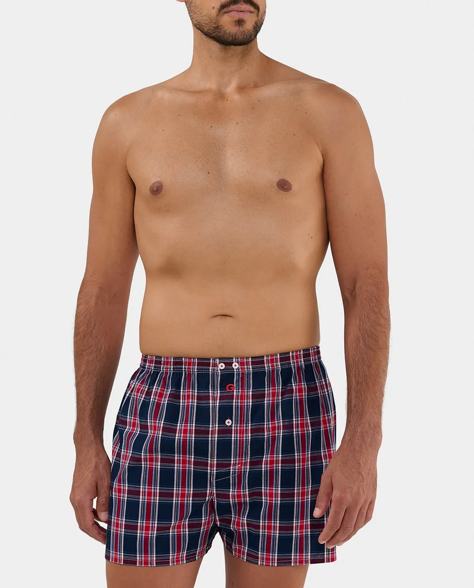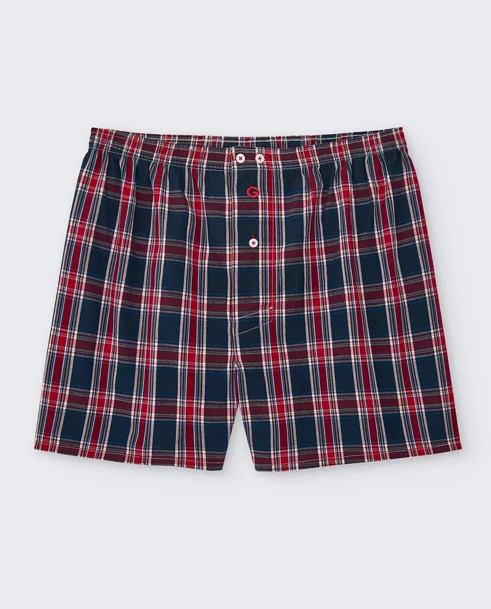 Тканевые боксеры с разрезом, американский шов, крупная клетка синего и красного цветов, покрытая эластичная талия, 3 пуговицы и вышитый логотип.