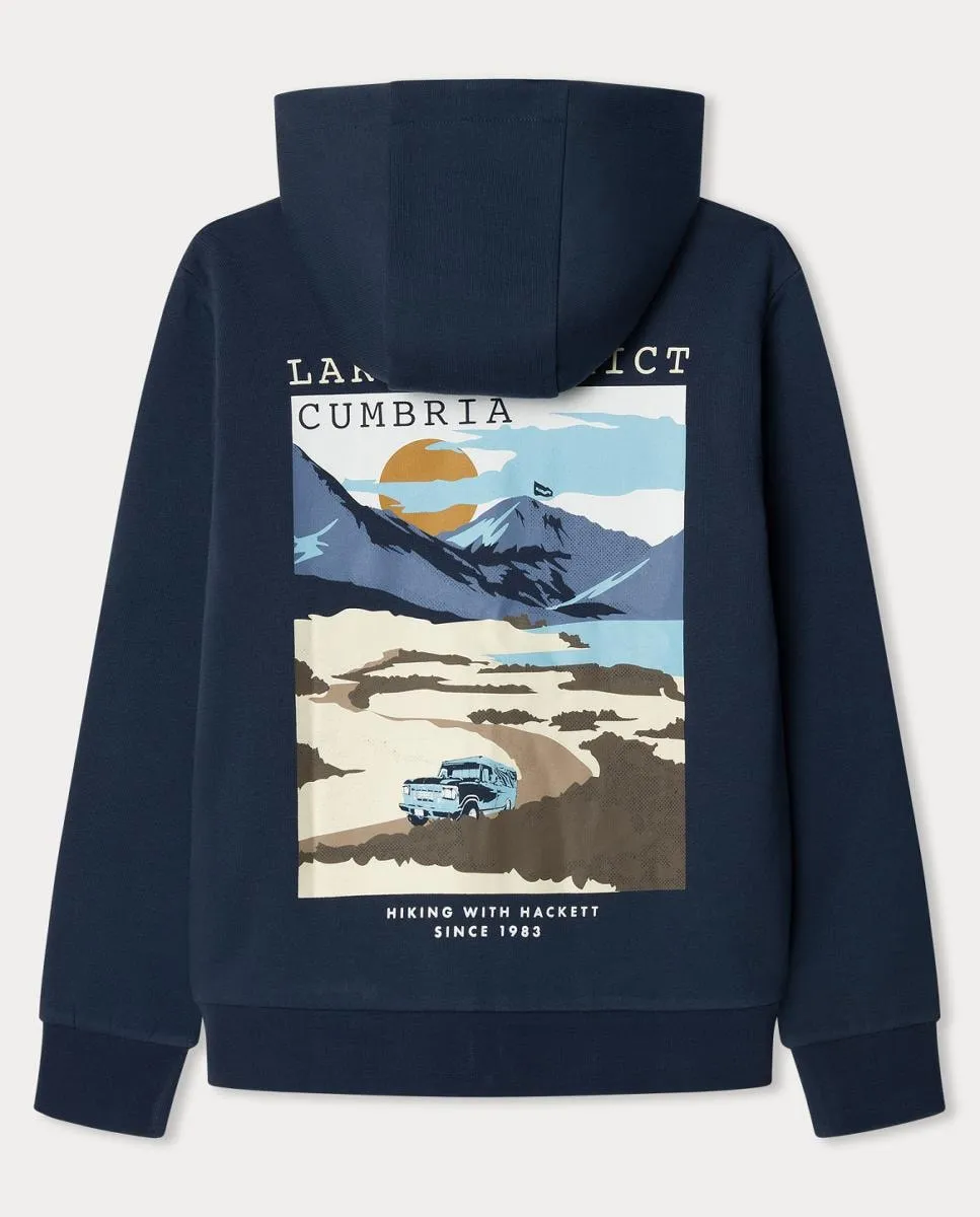 Толстовка с капюшоном, на молнии, с логотипом спереди и графическим рисунком на спине.