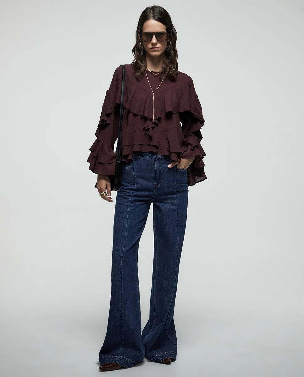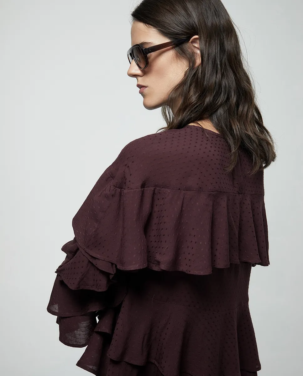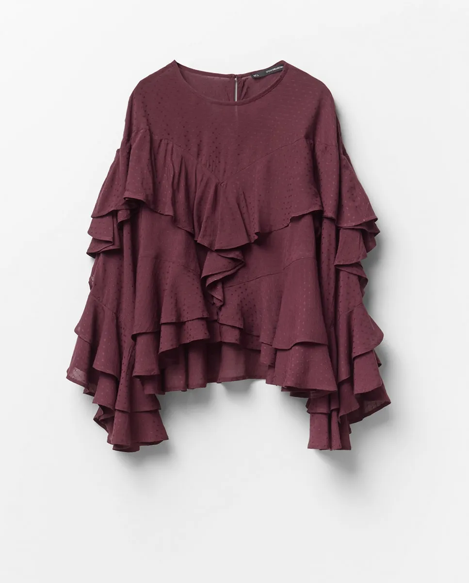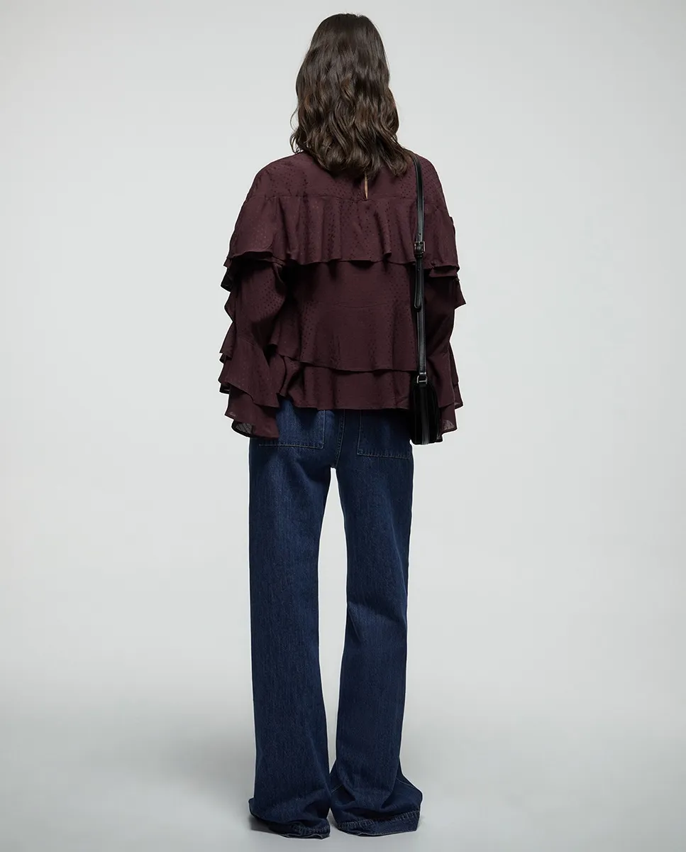 Блузка с квадратным вырезом и длинными рукавами с рюшами. Застежка сзади на пуговицу