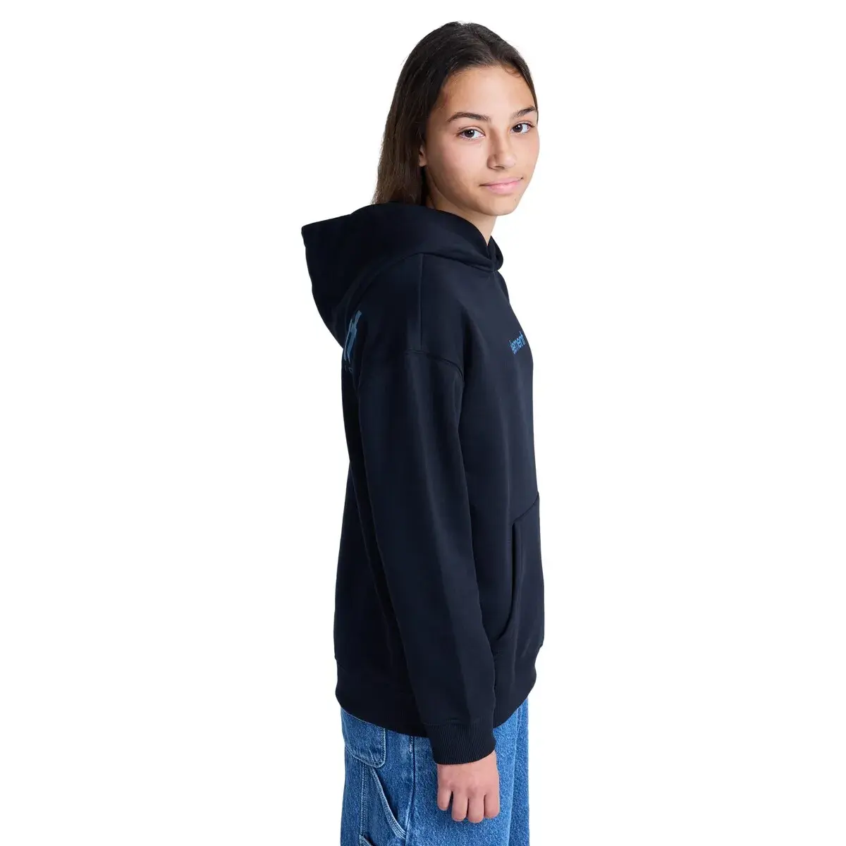 Толстовка с капюшоном для детей 8-16 лет. Особенности включают: Ткань: обычный хлопок с переработанным хлопком и полиэстером [280 г/м²], стандартный крой, флисовая отделка, внутренний слой с ворсом, широкий карман, капюшон на подкладке из однослойного джерси, принты на водной основе на груди и спине, прямоугольная фирменная этикетка.