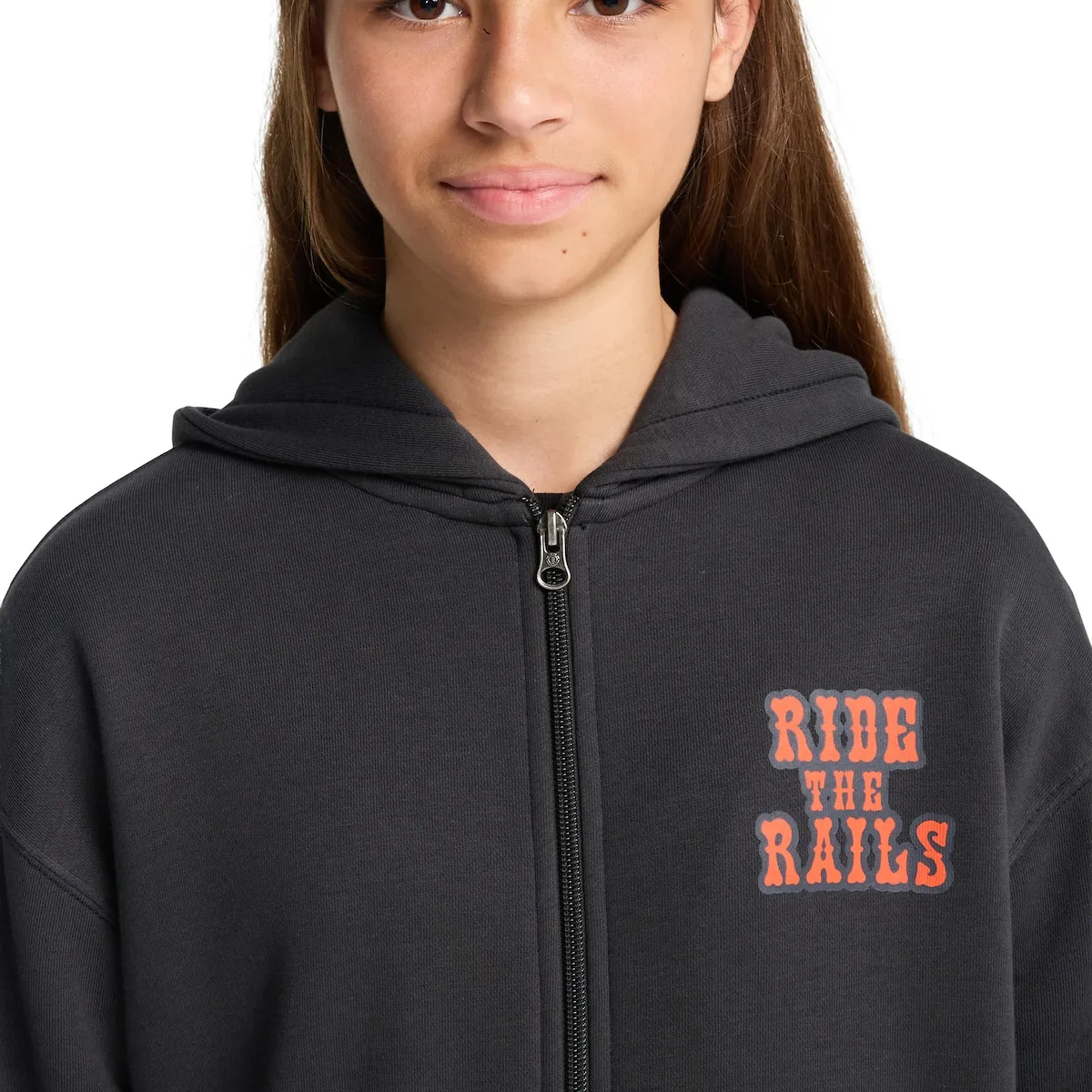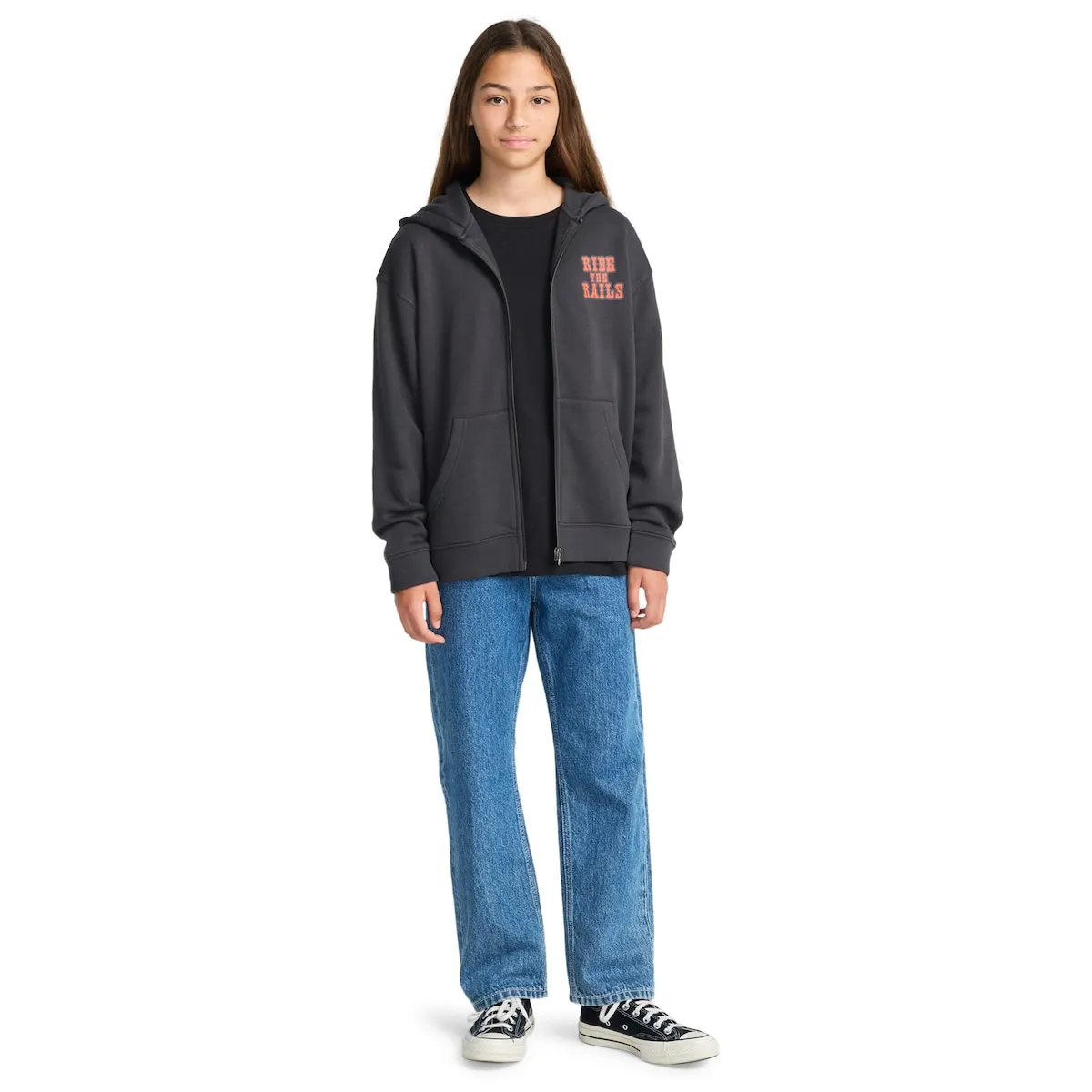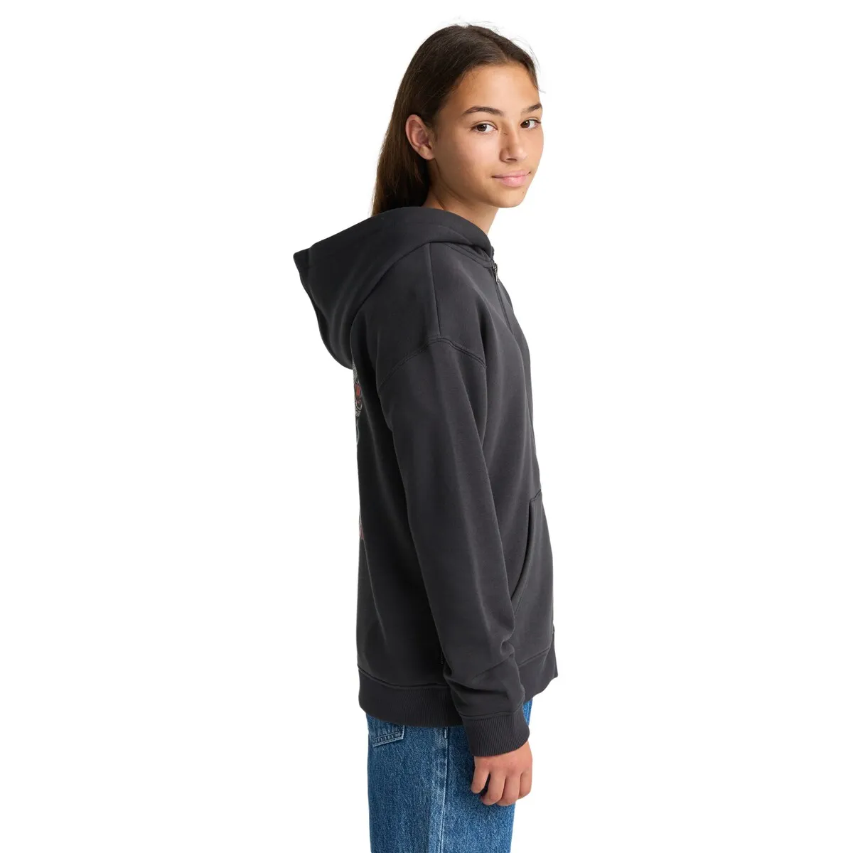 Толстовка с капюшоном и молнией для детей 8-16 лет. Характеристики включают: Ткань: обычный хлопок с переработанным хлопком и полиэстером [280 г/м2], Обычный крой, Флисовая отделка, Мягкая внутренность, Большой карман, Капюшон на подкладке из однослойного трикотажа, Принты на водной основе на груди и спине, Прямоугольная фирменная этикетка.