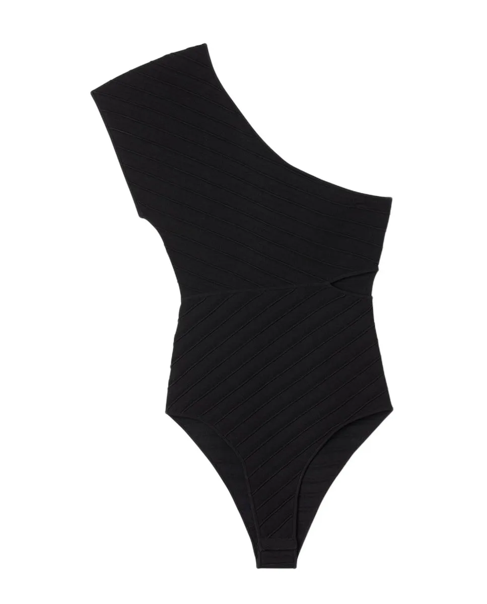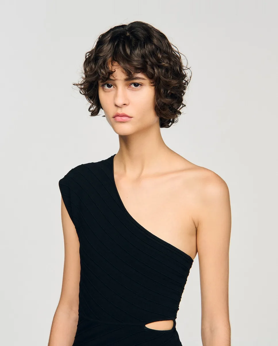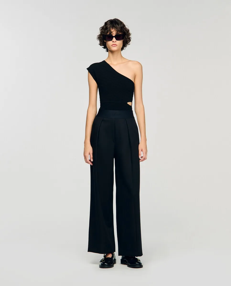 Асимметричное боди из текстурированной вязки с кнопками в области шагового шва. Асимметричное боди Sandro для женщин. Тонкая гладкая вязка. Кнопки в области шагового шва.