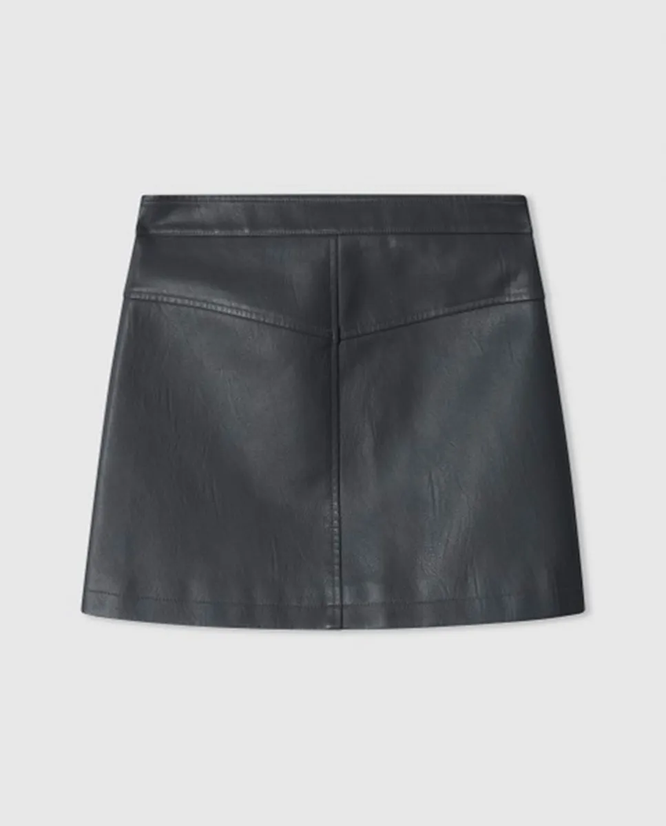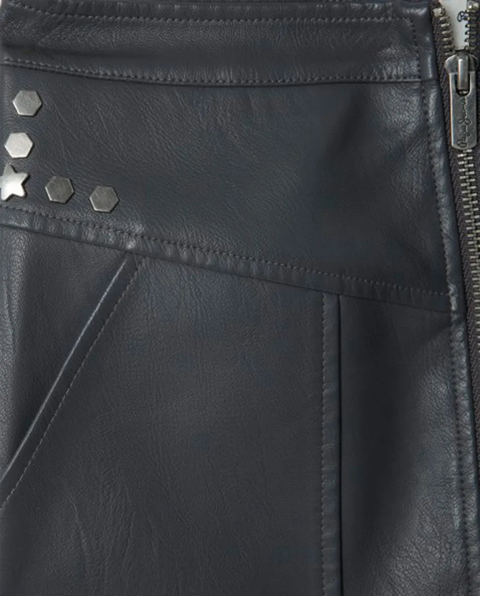 Юбка с эффектом кожи черного цвета, с металлической молнией спереди, кокеткой и деталями с металлическими заклепками. Сочетайте ее с подходящей байкерской курткой!