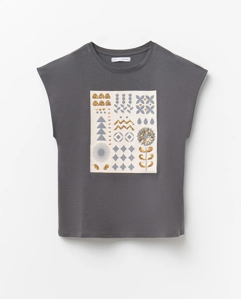 Футболка без рукавов с графическим принтом и деталями из пайеток. 100% хлопок