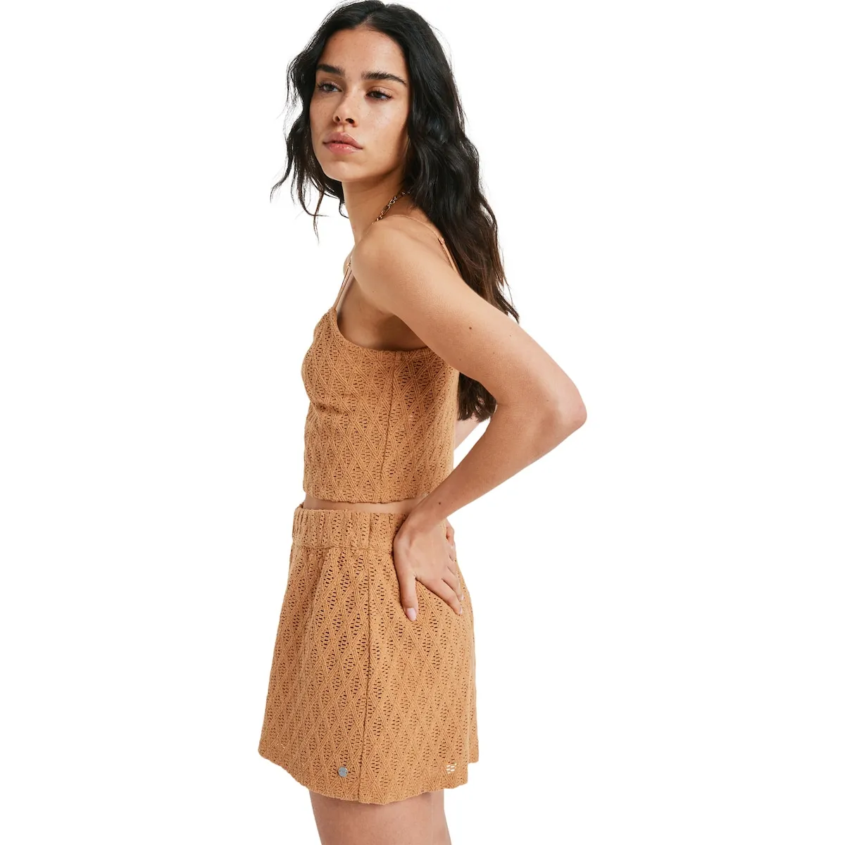Вязаные крючком шорты для женщин. Характеристики включают: Материал: хлопок крючком [325 г/м²], Подкладка: полностью трикотажная легкая подкладка, Крой: обычная длина шорт, Застежка/Пояс: эластичный пояс и металлическая пластина с сердцем Roxy.