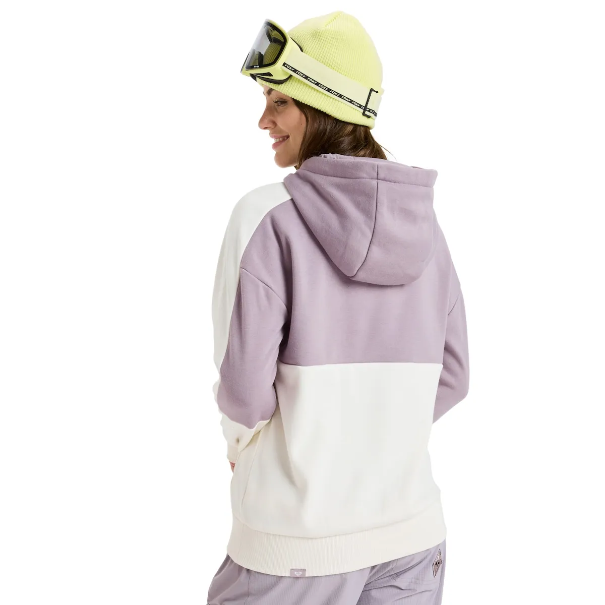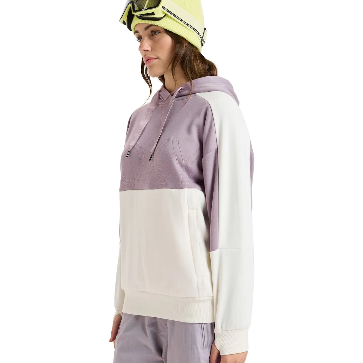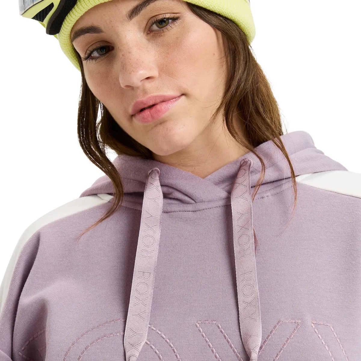 Техническая футболка для женщин. Характеристики включают: Технология: обработка DWR ROXY DryFlight, Крой: обычный, классический крой для свободы движения и максимального комфорта, ЭКО-МЕРЫ: водоотталкивающее покрытие без ПФАС, Ткань: флисовый материал из полиэстера, вискозы и эластана, Капюшон с перекрестными шнурками и регулируемый шнурками, Манжеты с ребристой вязкой и отверстием для большого пальца.
