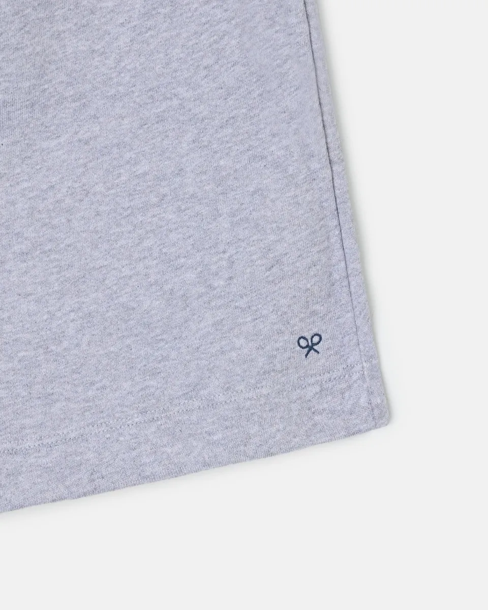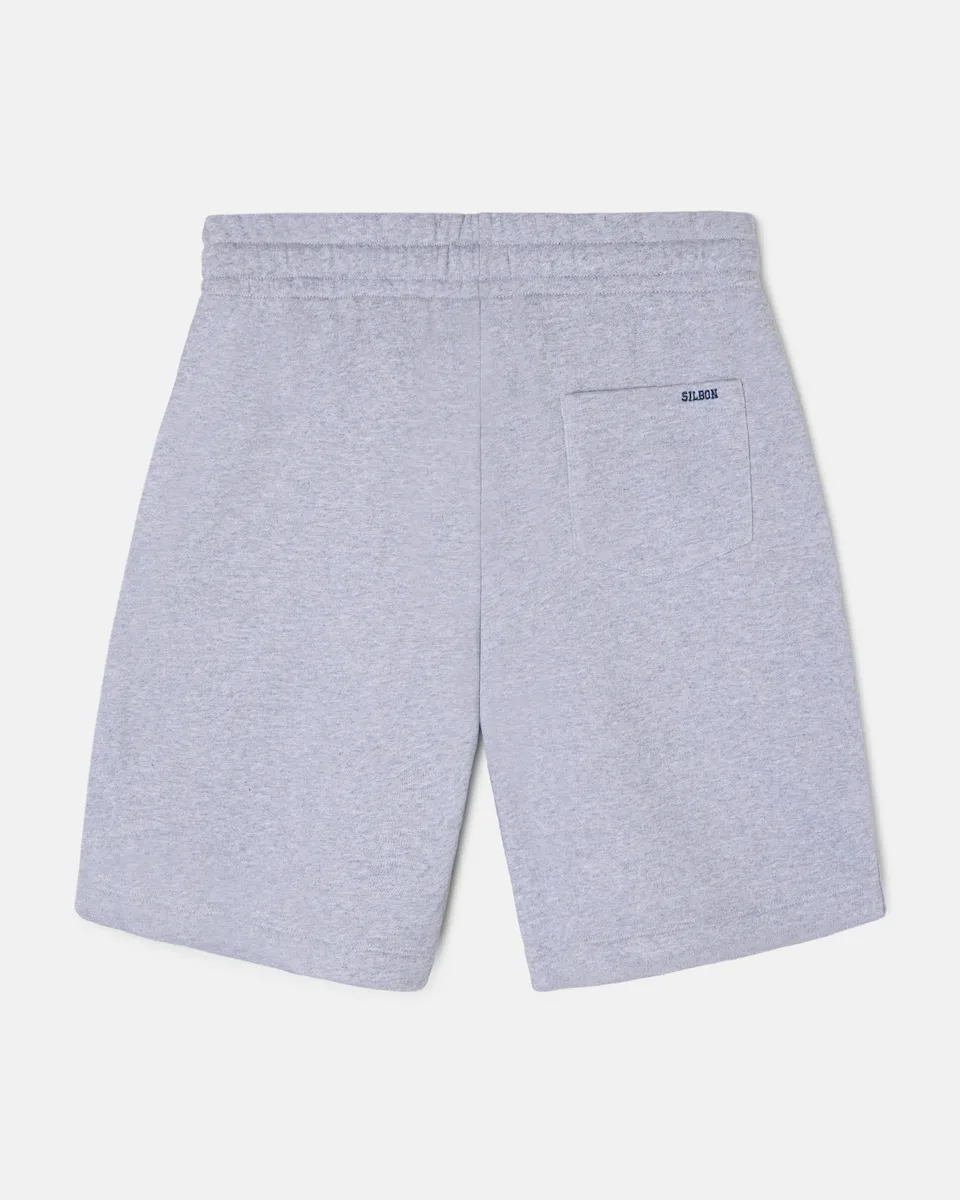 Серые спортивные бермуды из хлопковой смеси. Имеют эластичный пояс с регулируемым шнурком и задние карманы. Детали вышивки контрастного темно-синего цвета присутствуют на заднем кармане и в нижней передней части.