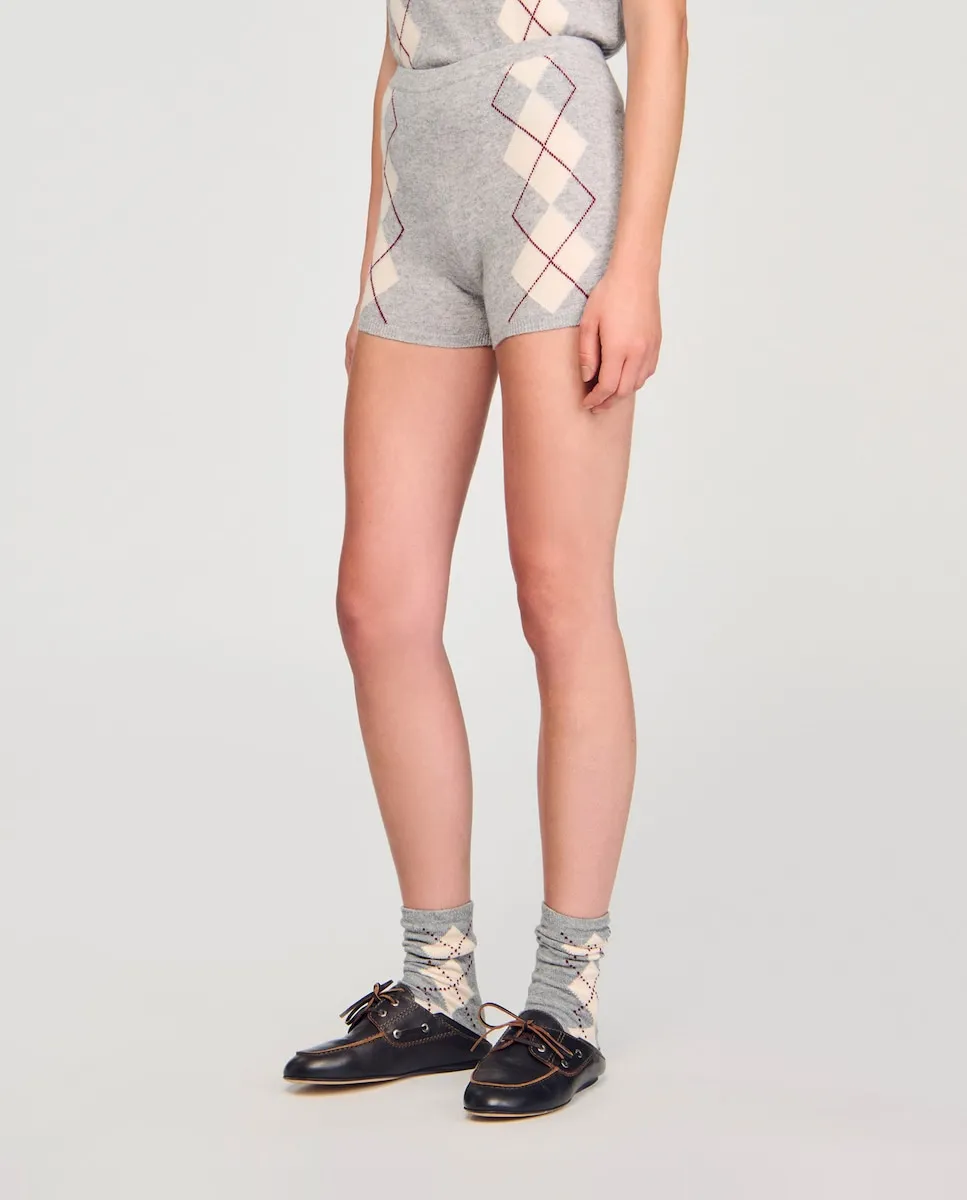 Вязаные шорты с ромбовидным узором и эластичным поясом. Женские шорты Sandro. Ромбовидный узор. Эластичный пояс. Стандартная посадка. Тонкая вязка. 90% шерсть, 10% кашемир.