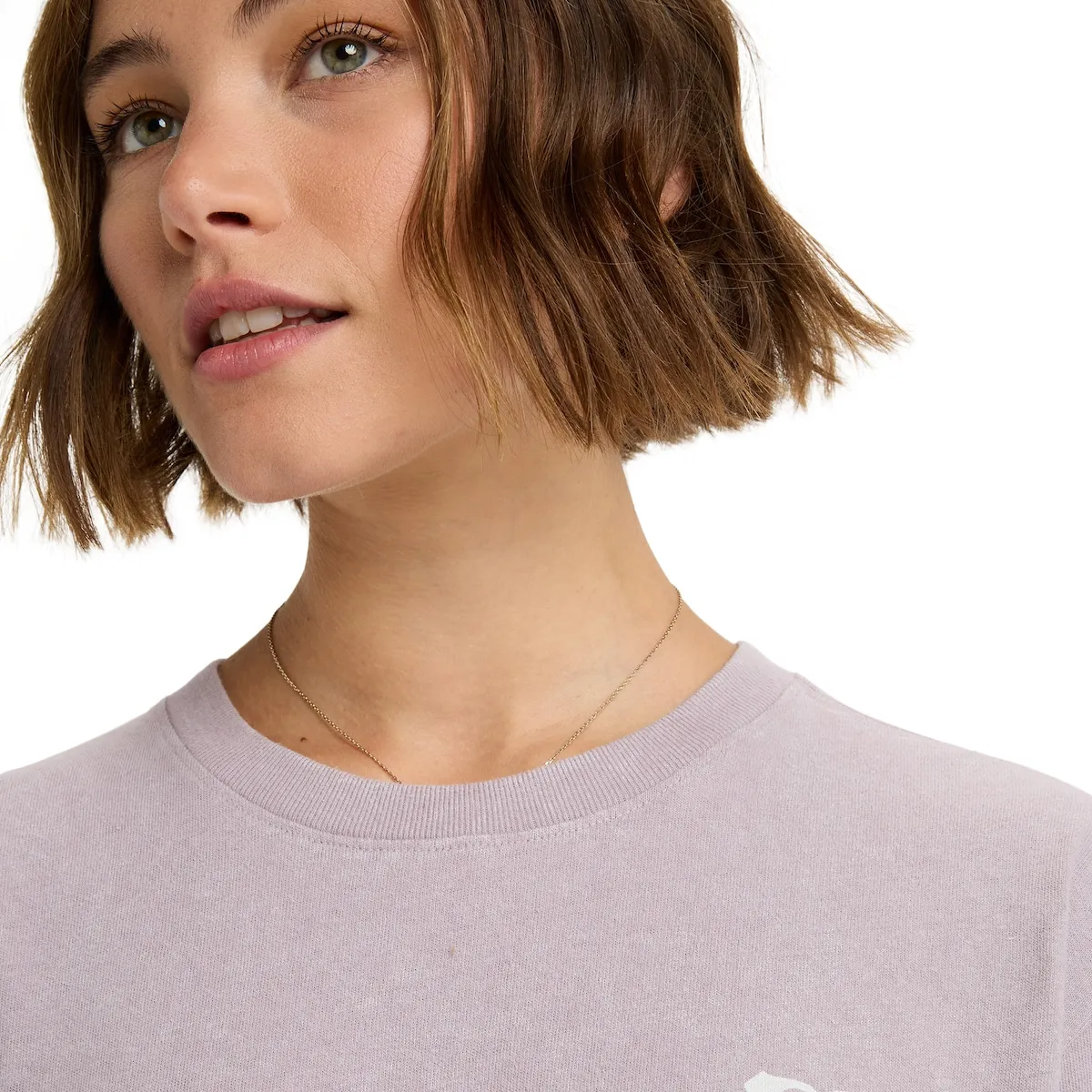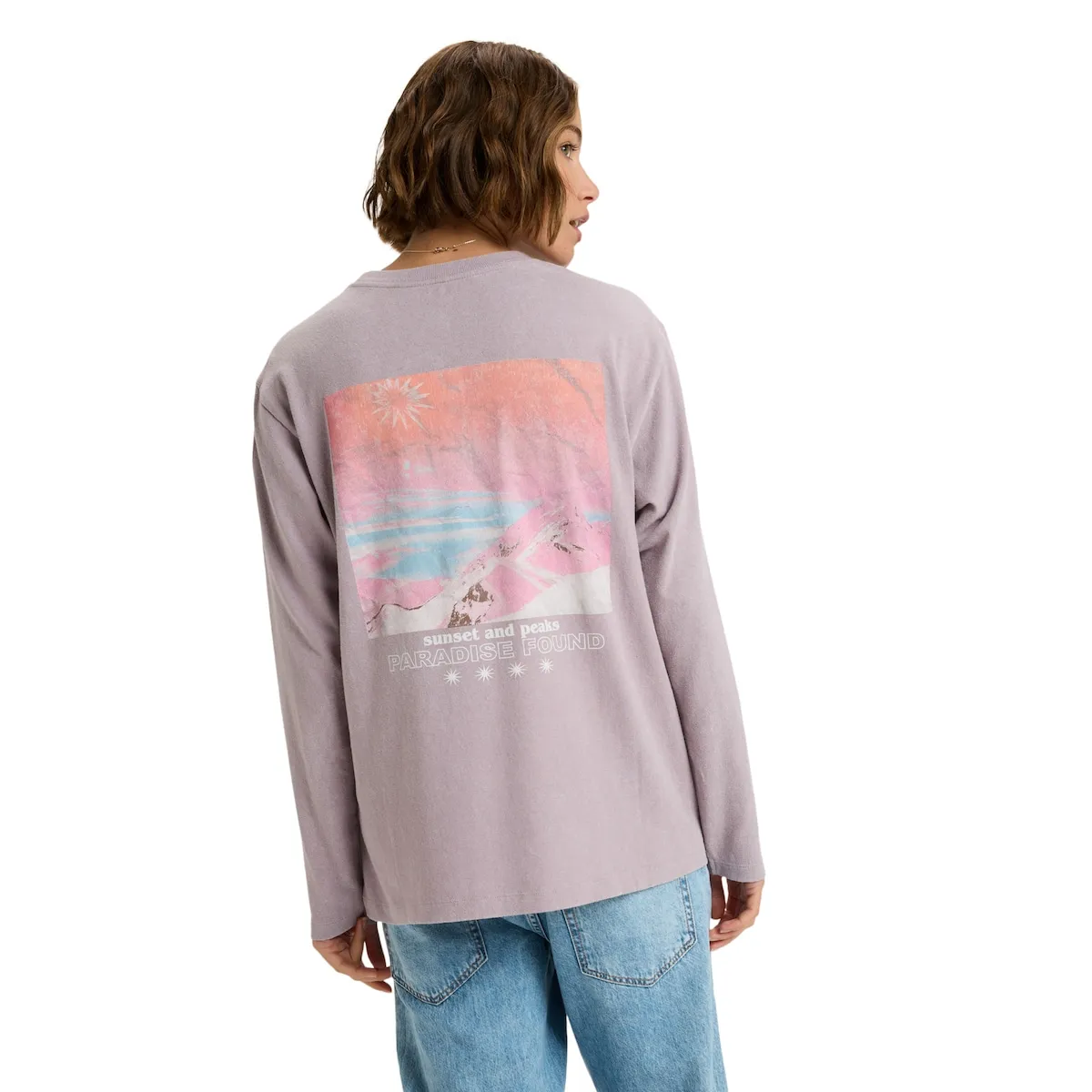 Женская футболка с длинным рукавом. Характеристики включают: Ткань: джерси из органического хлопка, Крой: свободный, Стирка: оптическая обработка, Вырез: круглый, И принт на передней части и рисунок на спине или рукавах [в зависимости от модели].